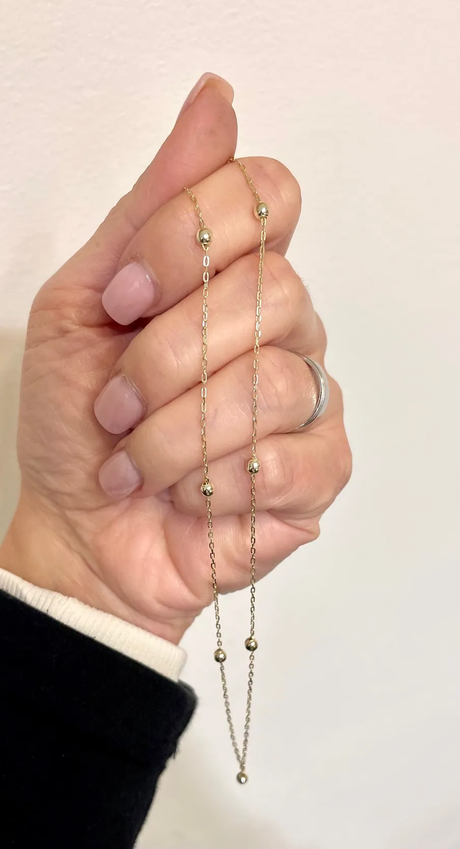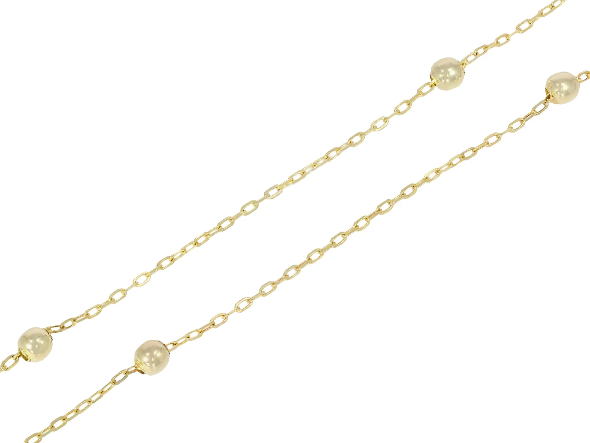 Jemnú zlatú retiazku s podlhovastými očkami zdobia hladké lesklé gulôčky s priemerom 3 mm.