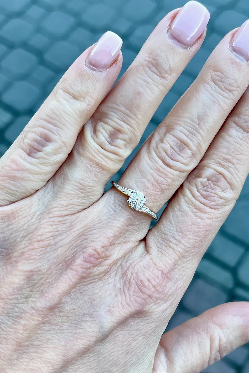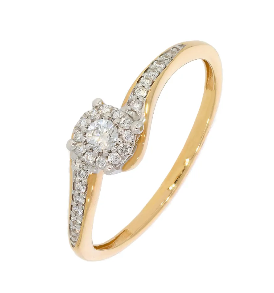 Dokonale trblietavý dámsky prsteň zo žltého 14 karátového zlata zdobia prírodné diamanty v celkovej váhe 0,15ct. Šperk zdobí tiež biele tónovanie zlata, ktoré nechá diamanty krásne vyniknúť. K prsteňu patrí tiež certifikát potvrdzujúci pravosť diamantov.