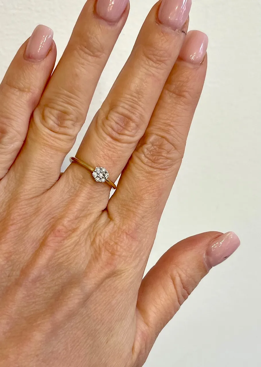 Darujte krásny zlatý prsteň zdobený prírodnými diamantmi v celkovej váhe 0,03ct. Šperk je vyrobený zo žltého a bieleho 14 karátového zlata a patrí k nemu tiež certifikát potvrdzujúci pravosť diamantov.