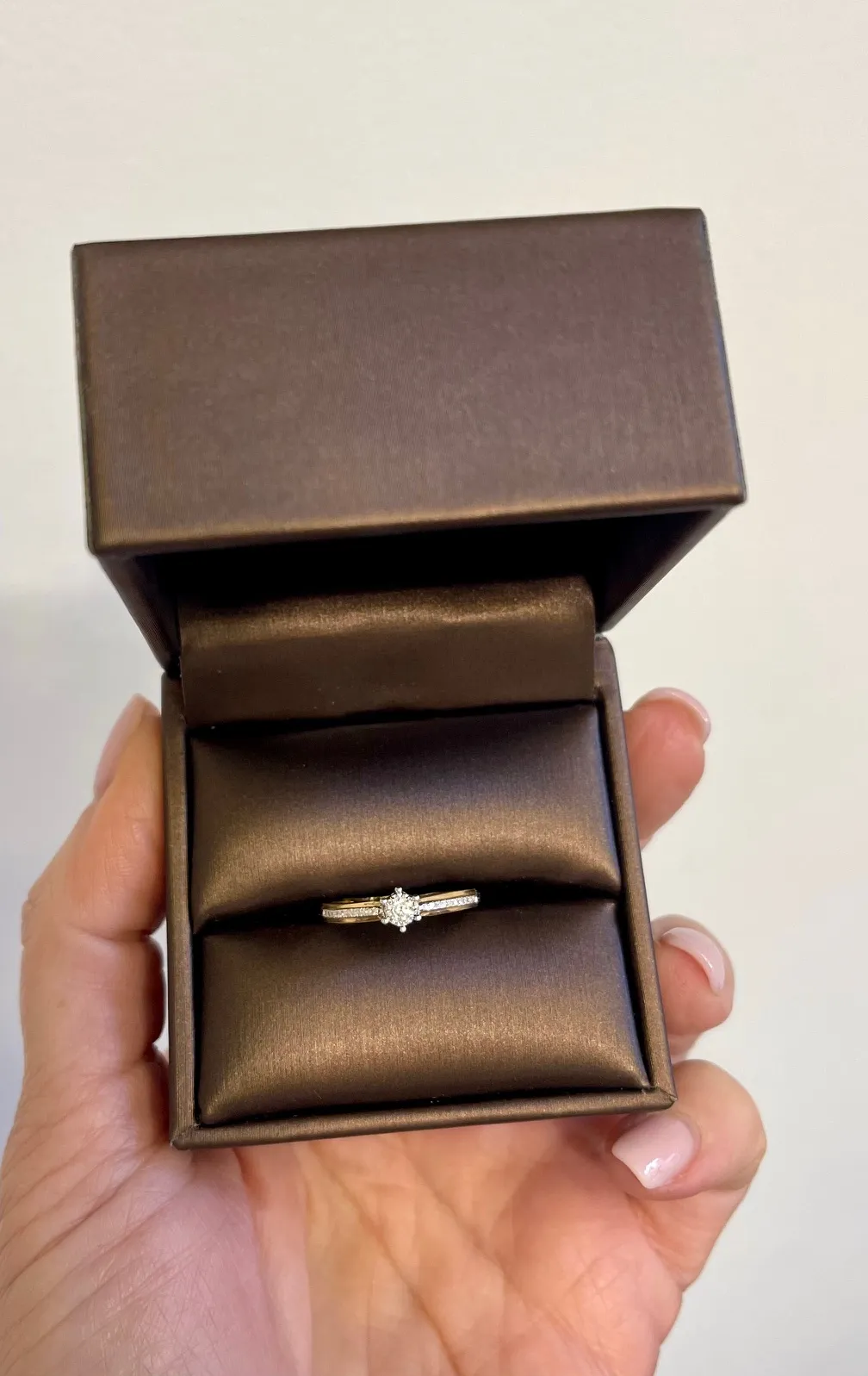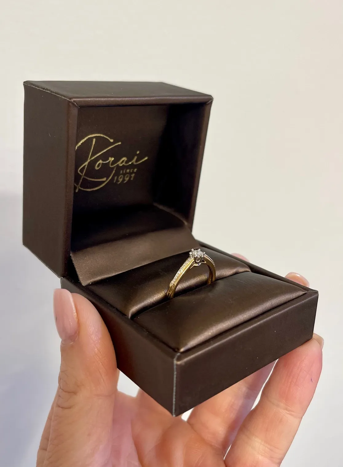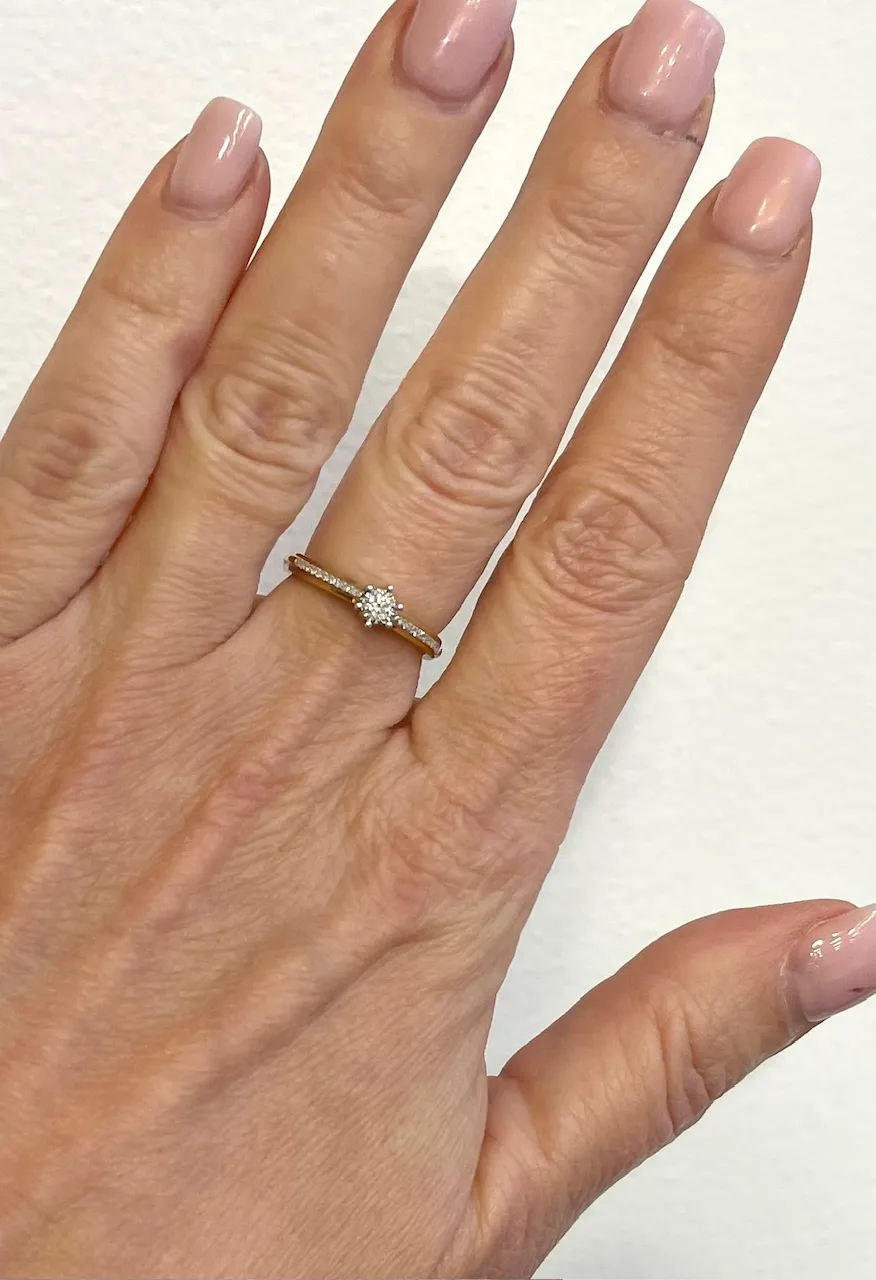 Krásny zlatý prsteň zdobený prírodnými diamantmi v celkovej váhe 0,15ct. Šperk je vyrobený kombináciou žltého a bieleho zlata a patrí k nemu tiež certifikát potvrdzujúci pravosť diamantov.