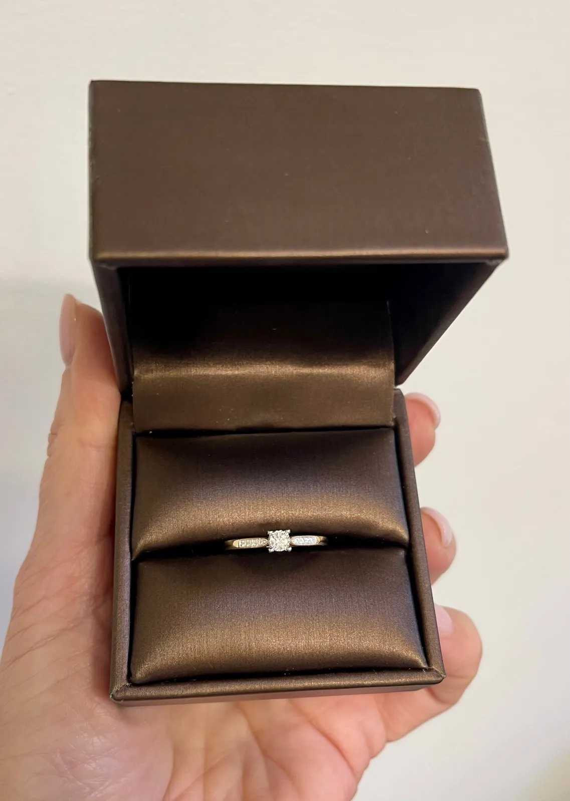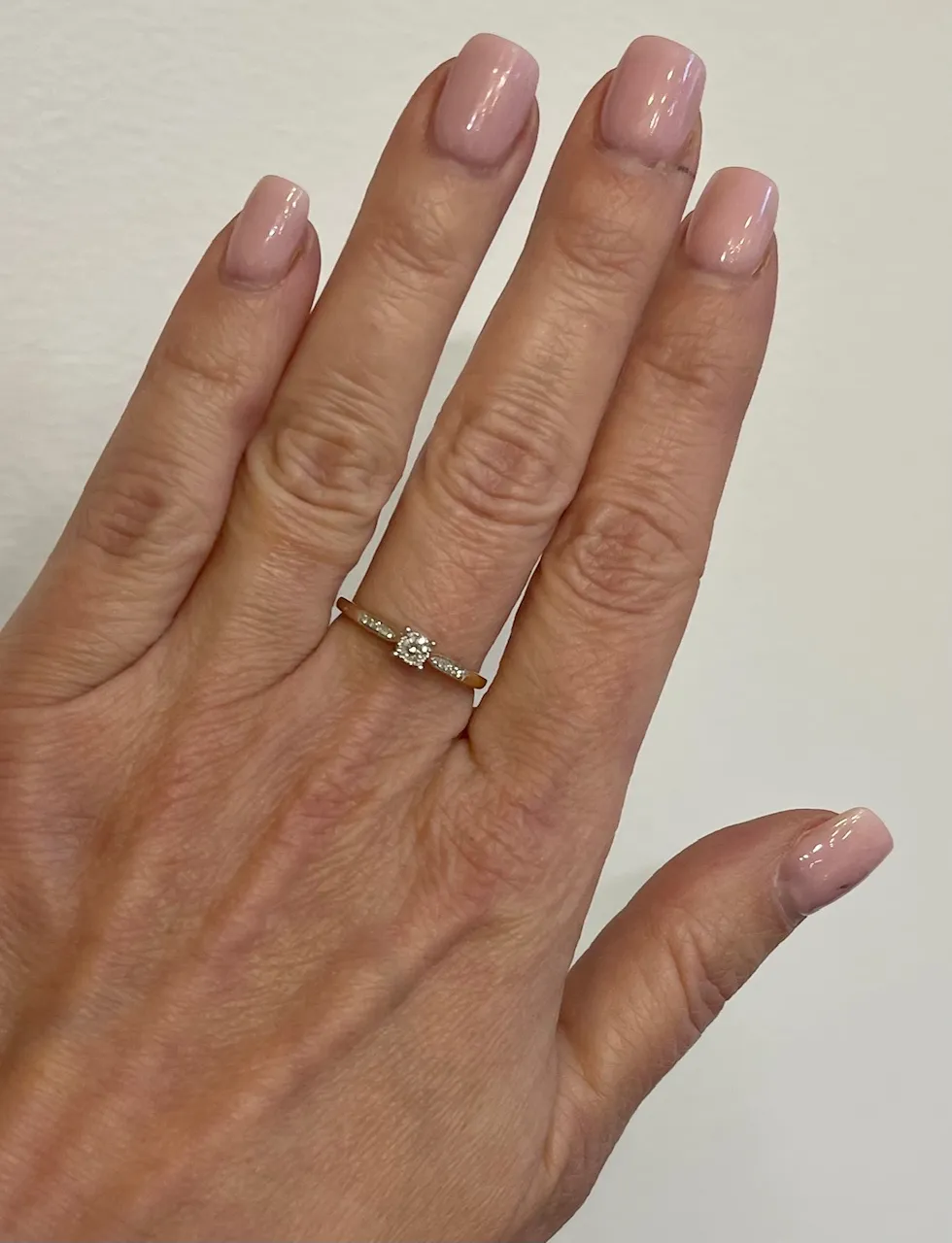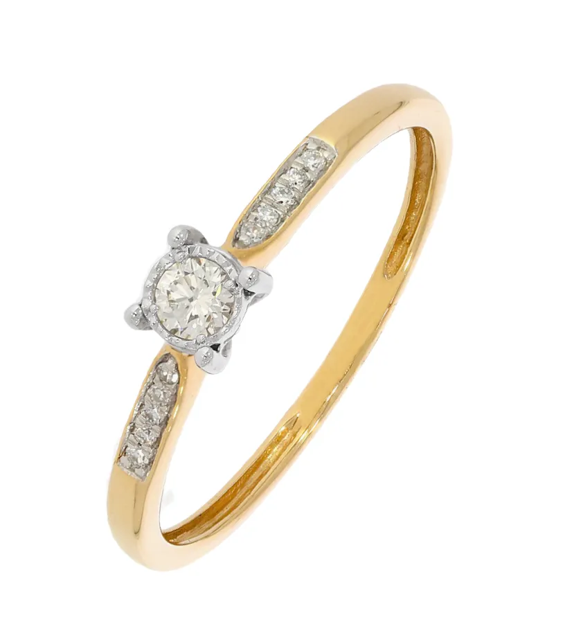 Dokonale trblietavý dámsky zlatý prsteň zdobený prírodnými diamantmi v celkovej váhe 0,13ct. Prsteň je vyrobený zo žltého a bieleho 14k zlata a je vhodný aj ako zásnubný šperk. K prsteňu patrí tiež certifikát potvrdzujúci pravosť diamantov.