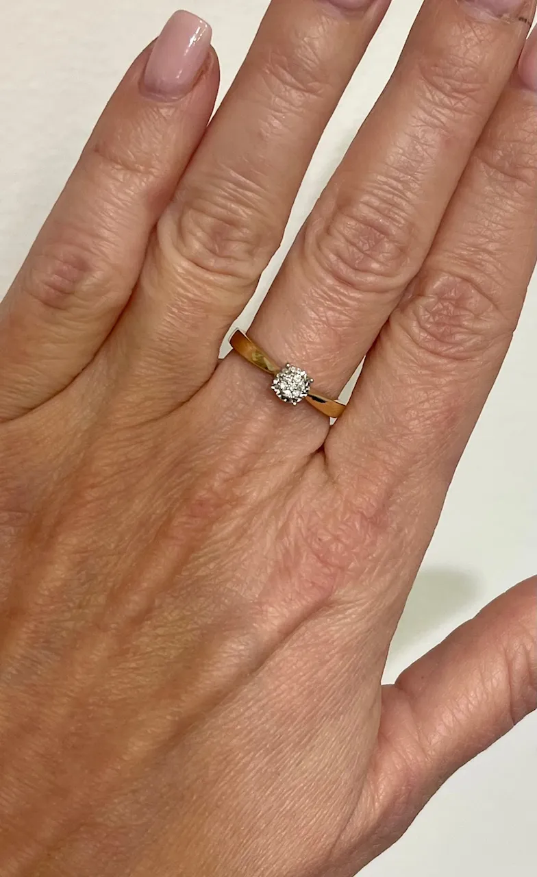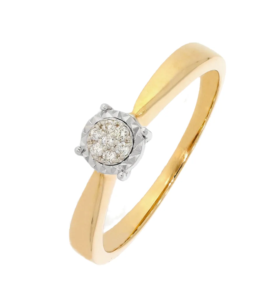 Krásny diamantový prsteň vyrobený zo žltého a bieleho 14 karátového zlata. Šperk zdobia prírodné diamanty v celkovej váhe 0,05ct. Prsteň má lesklú povrchovú úpravu a je ideálny aj ako zásnubný šperk. K prsteňu patrí tiež certifikát potvrdzujúci pravosť diamanotv.