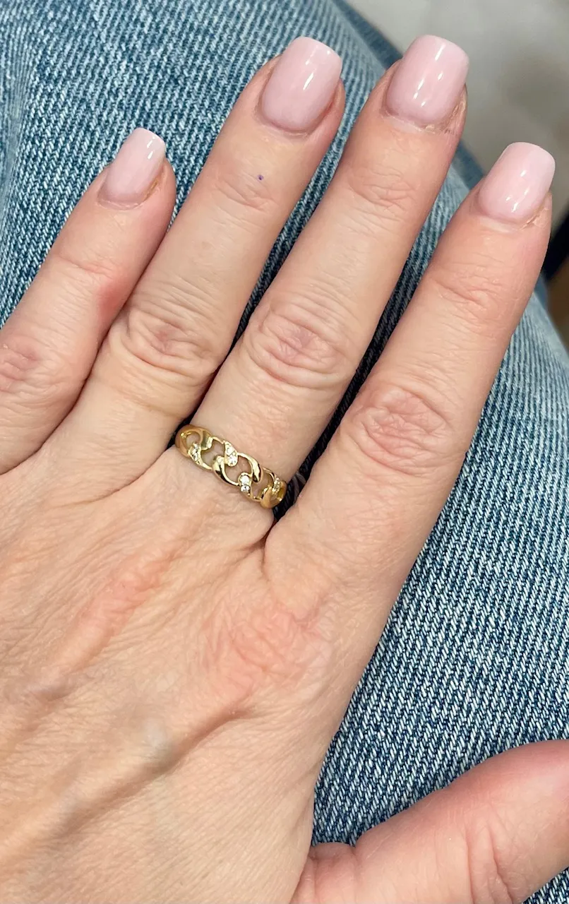 Krásny zlatý prsteň s moderným dizajnom očarí Vás aj Vaše okolie. Vyrobený je zo žltého 14k zlata a zdobia ho biele zirkóny.
