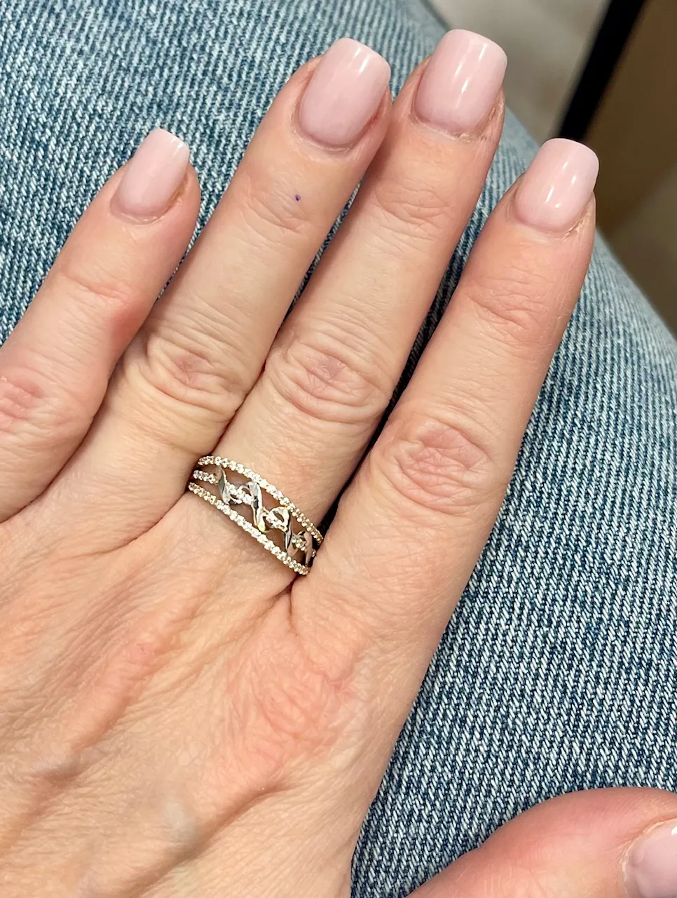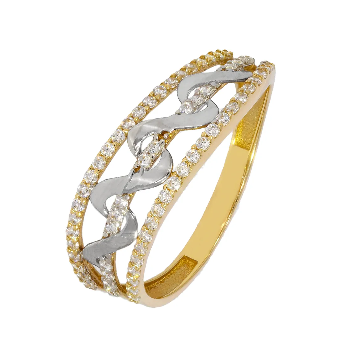 Krásny zlatý prsteň s jedinečným dizajnom je vyrobený kombináciou žltého a bieleho 14 karátového zlata. Prsteň zdobia tri línie bielych zirkónov.