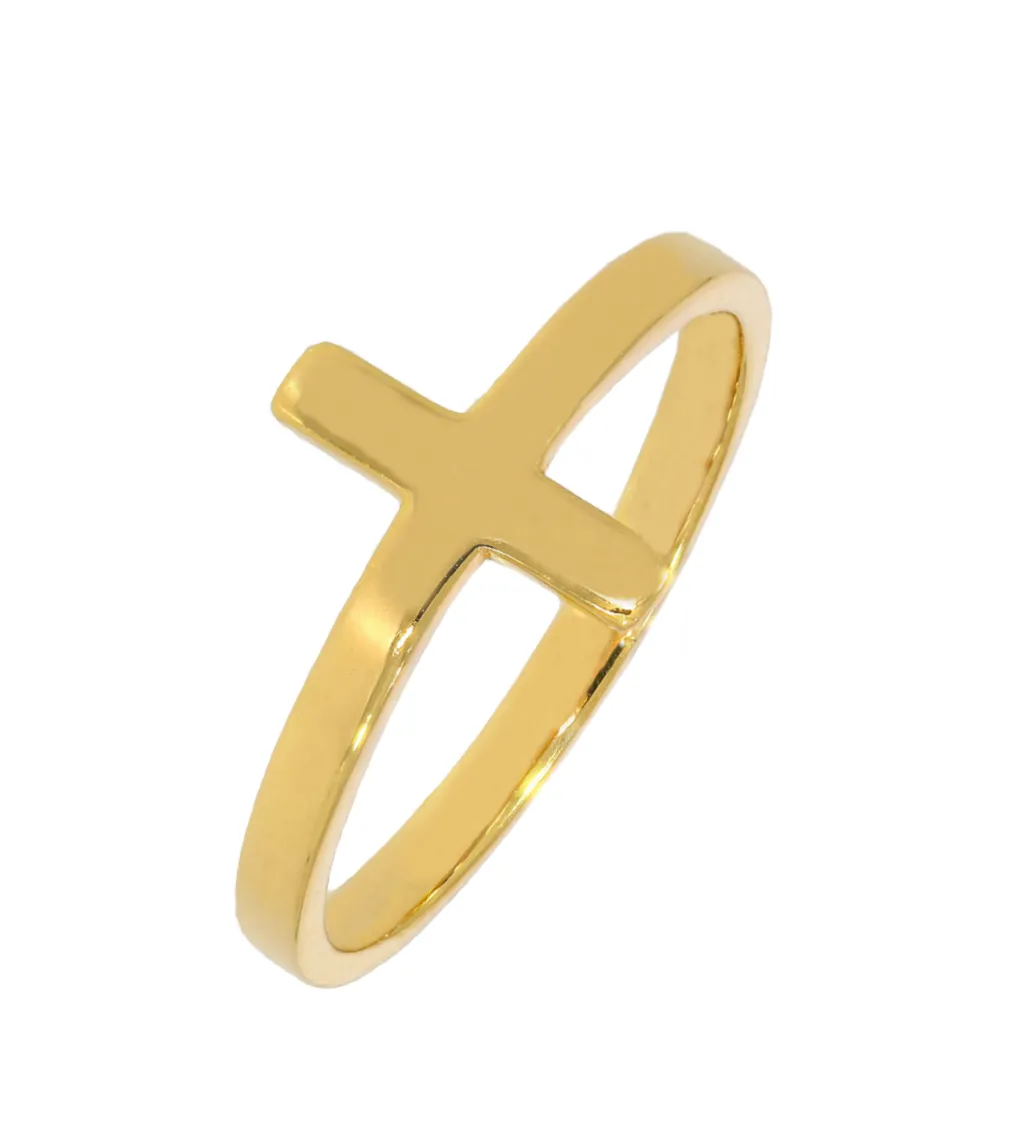 Pekný dámsky zlatý prsteň vyrobený v tvare kríža zo žltého 14 karátového zlata.