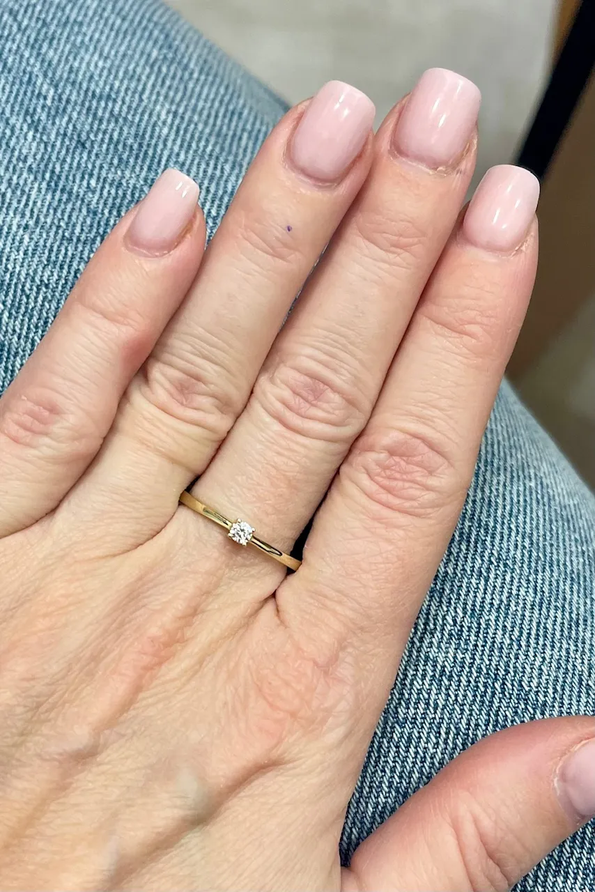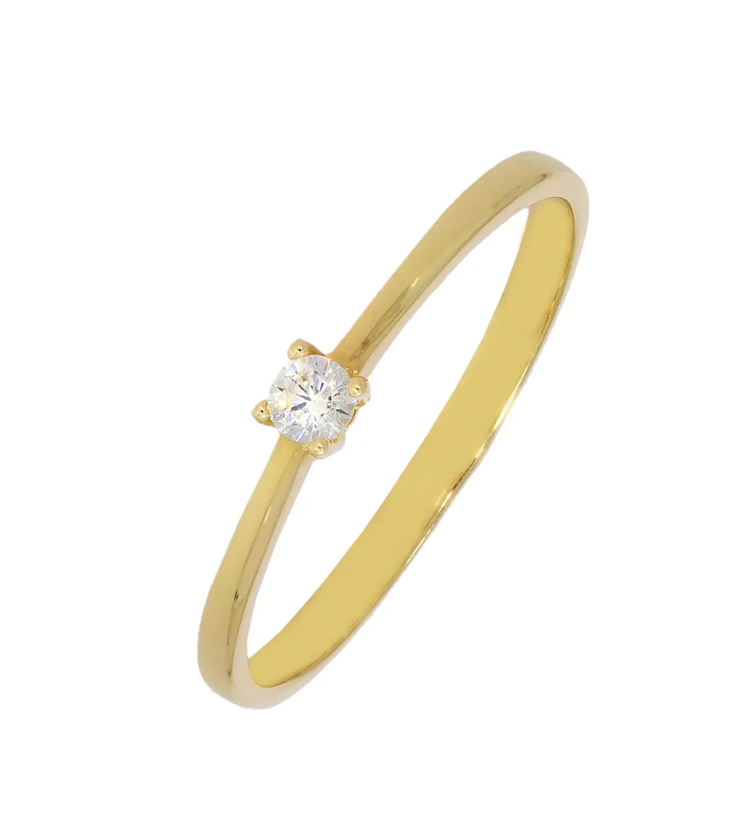 Pekný prsteň vyrobený zo žltého 14 karátového zlata zdobený bielym zirkónom. Prsteň je vhodný aj ako zásnubny šperk.
