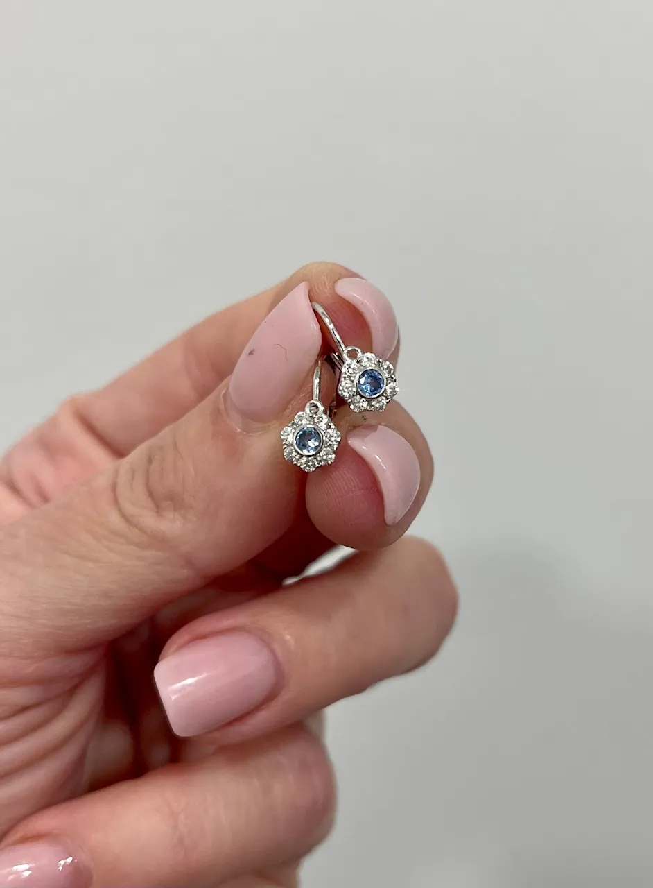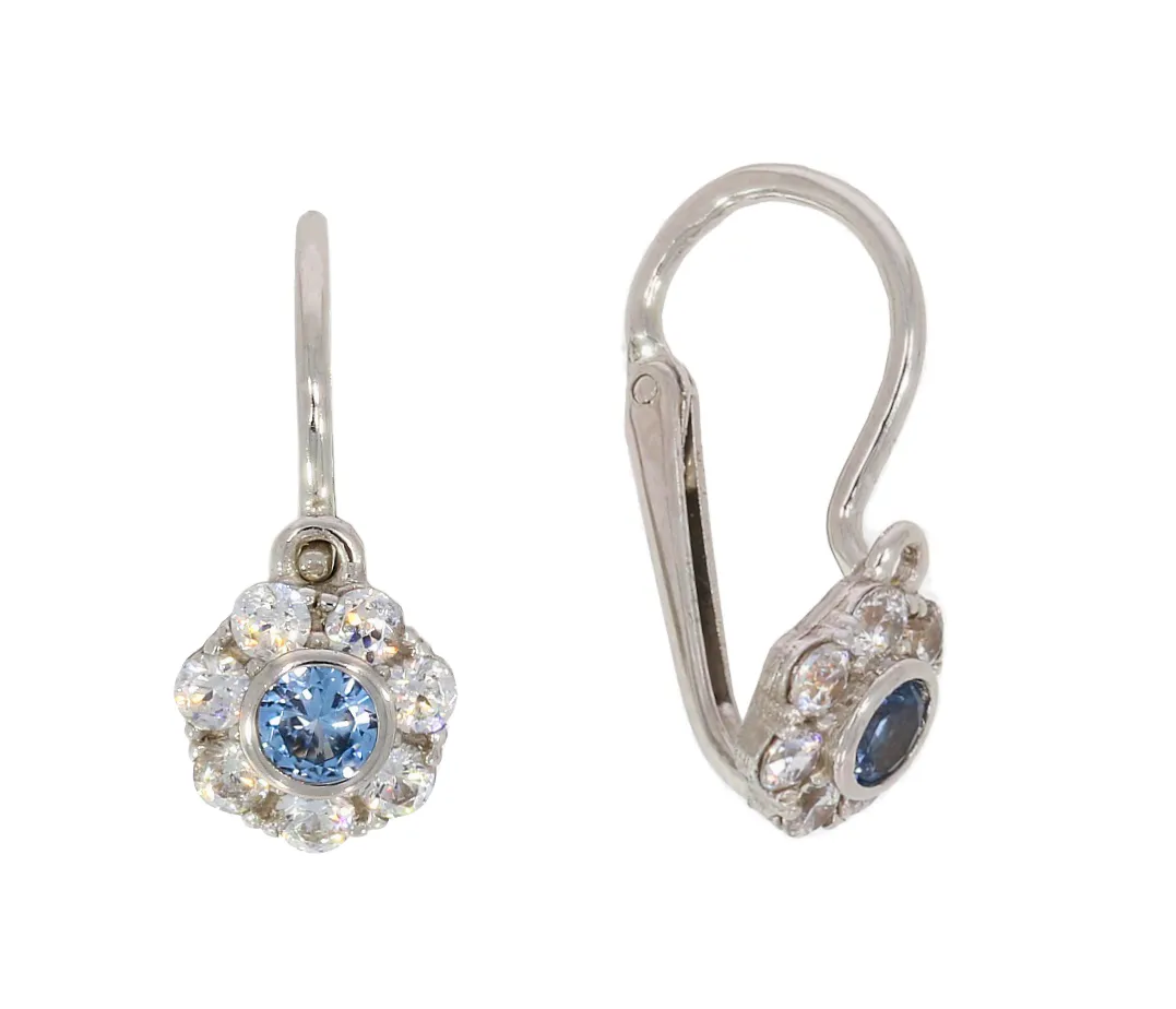 Krásne náušnice vyrobené z bieleho 14k zlata v tvare kvetiny vhodné pre dievčatká už od narodenia. Náušnice zdobia biele a modré zirkóny.