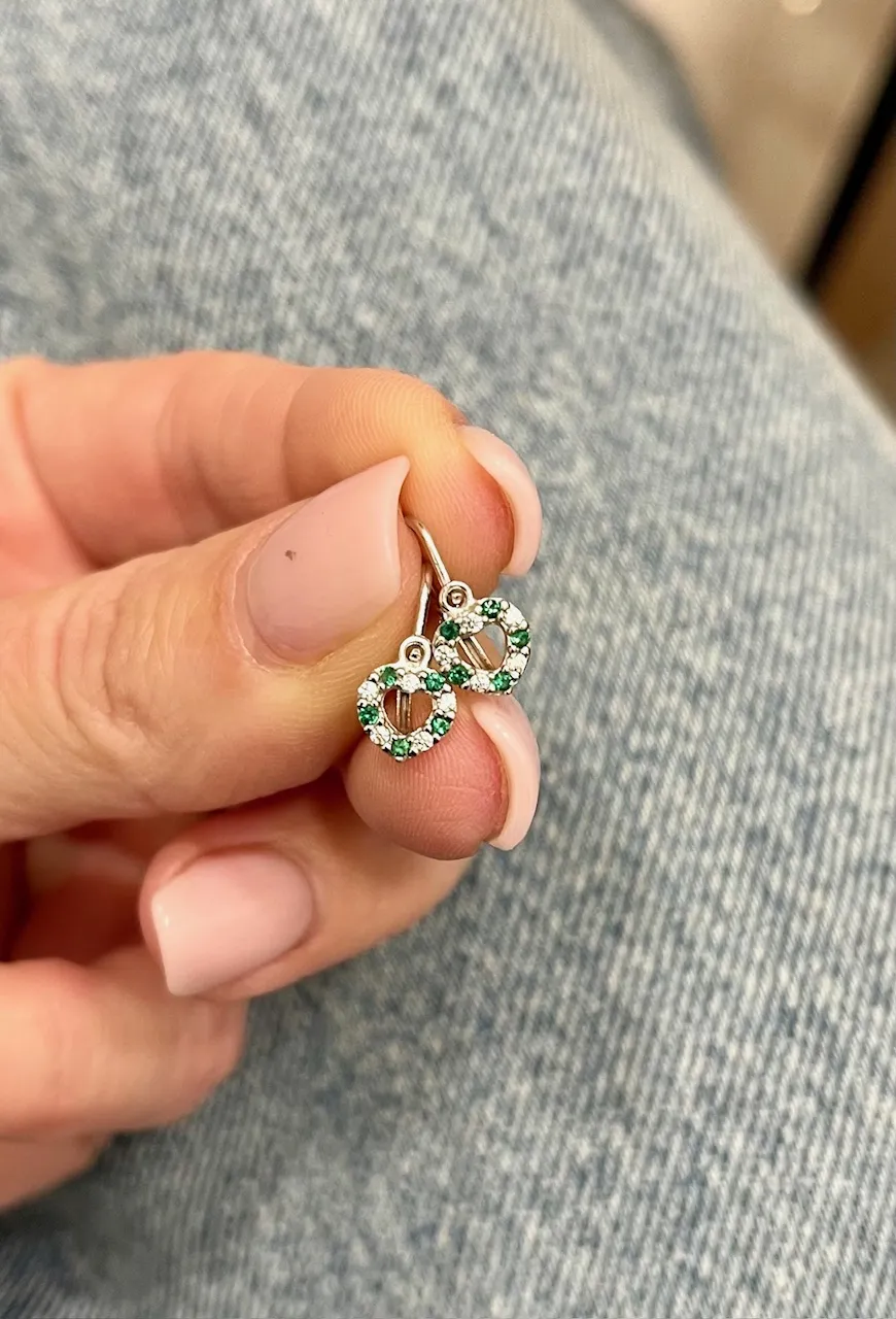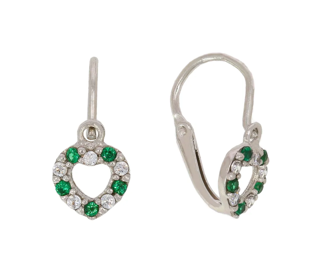 Krásne náušnice vyrobené z bieleho 14k zlata v tvare srdiečok sú zdobené zelenými a bielymi zirkónmi. Náušnice majú bezpečné zapínanie spredu a sú vhodné pre dievčatká už od narodenia.