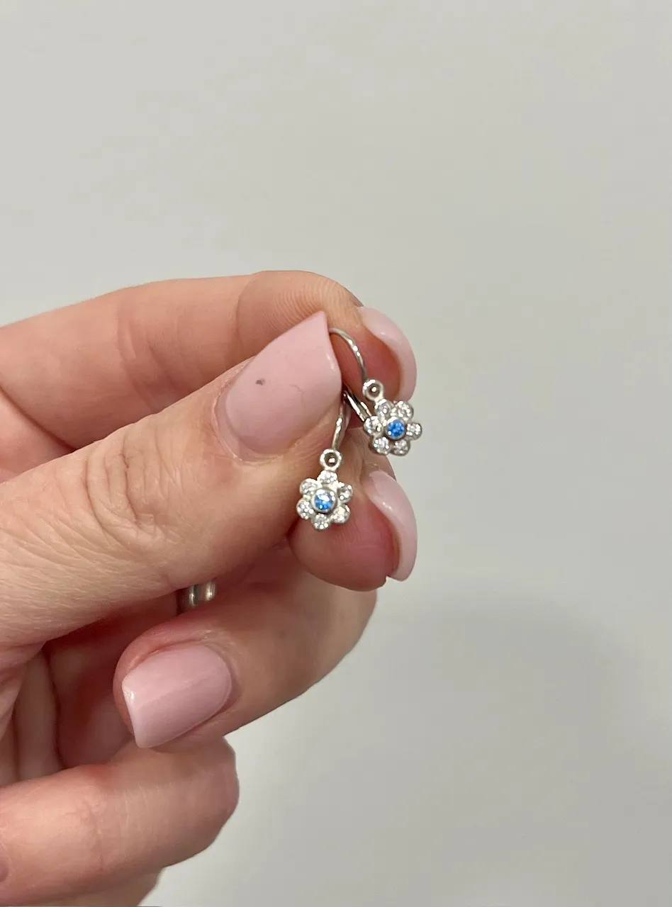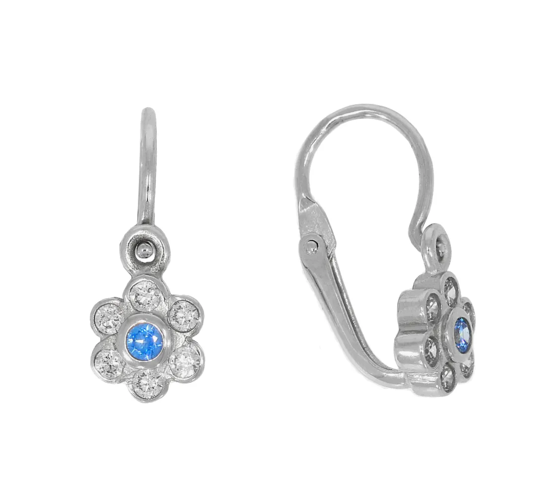 Roztomilé náušnice z bieleho zlata vyrobené v tvare kvetiny sú zdobené bielymi a modrými zirkónmi. Náušnice sú vhodné od narodenia do cca 8 rokov.