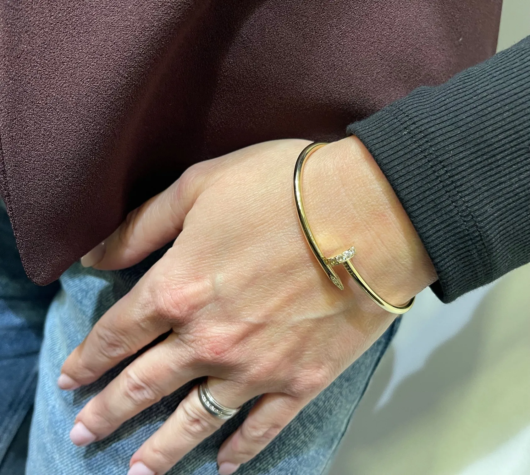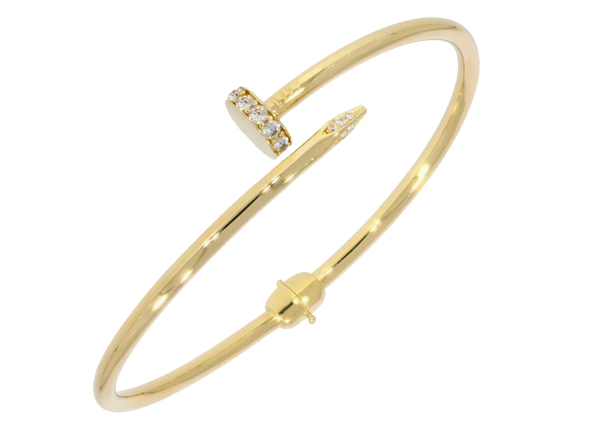 Buďte jedinečná aj vďaka modernému zlatému náramku s originálnym dizajnom. Vyrobený je zo žltého 14 karátového zlata a zdobia ho biele zirkóny. Vnútroný obvod náramku je cca 17cm.