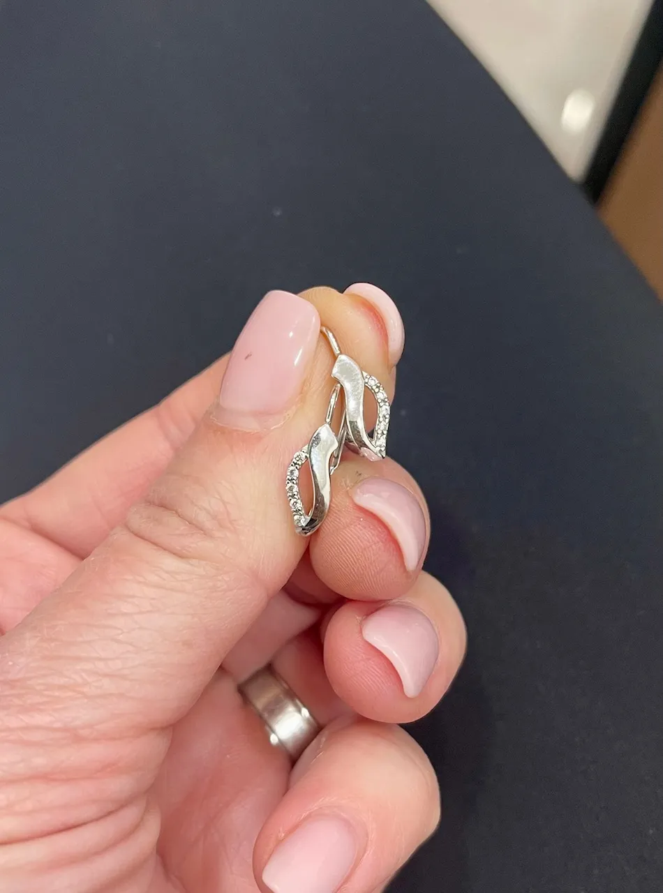 Pekné náušnice vyrobené z bieleho 14k zlata s lesklou povrchovou úpravou. Náušnice majú klasické patentové zapínanie a zdobia ich biele zirkóny.