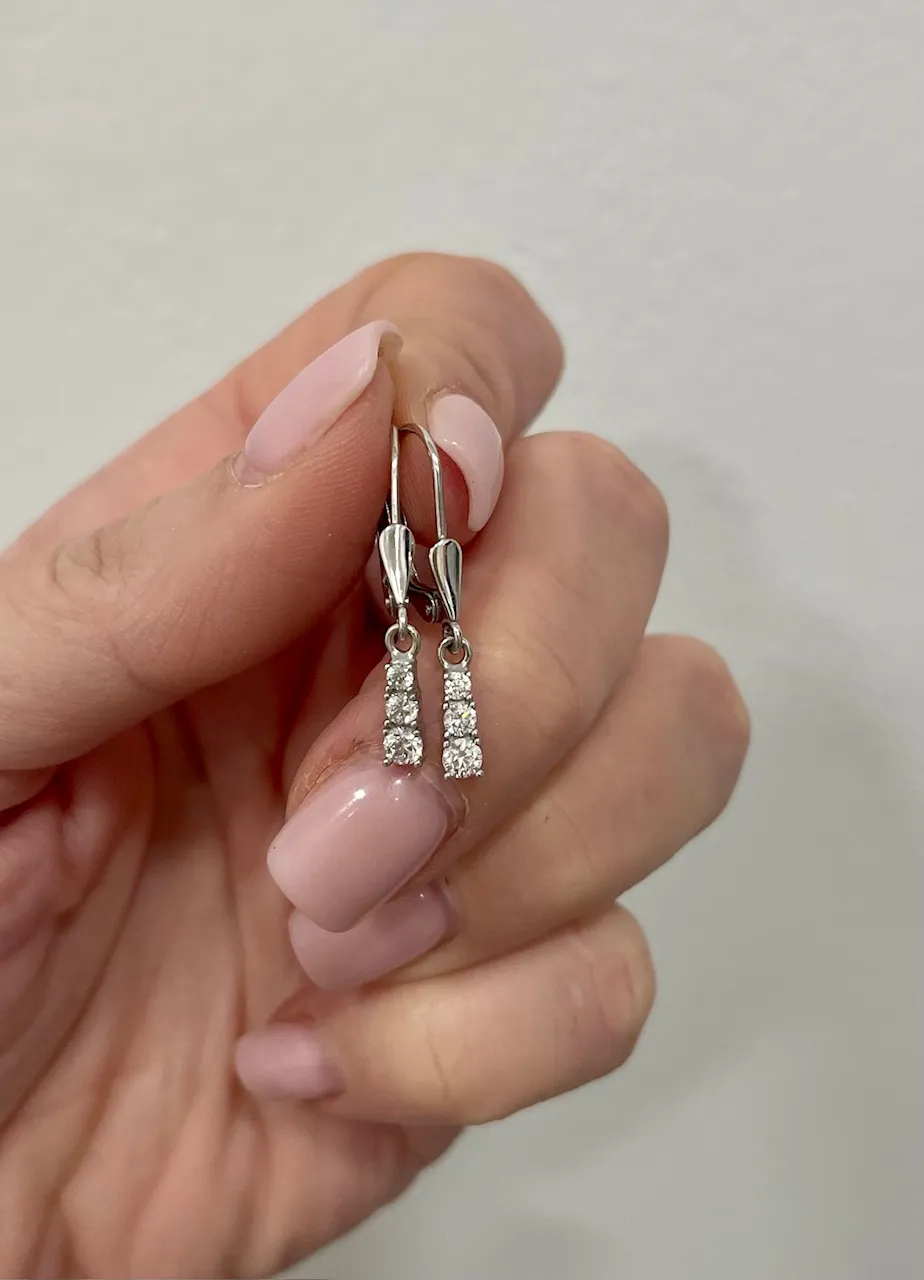 Netradičné visiace náušnice z bieleho 14 karátového zlata zdobia žiarivé biele zirkóny. Náušnice majú bezpečné patentové zapínanie a sú vhodné aj ako darček.