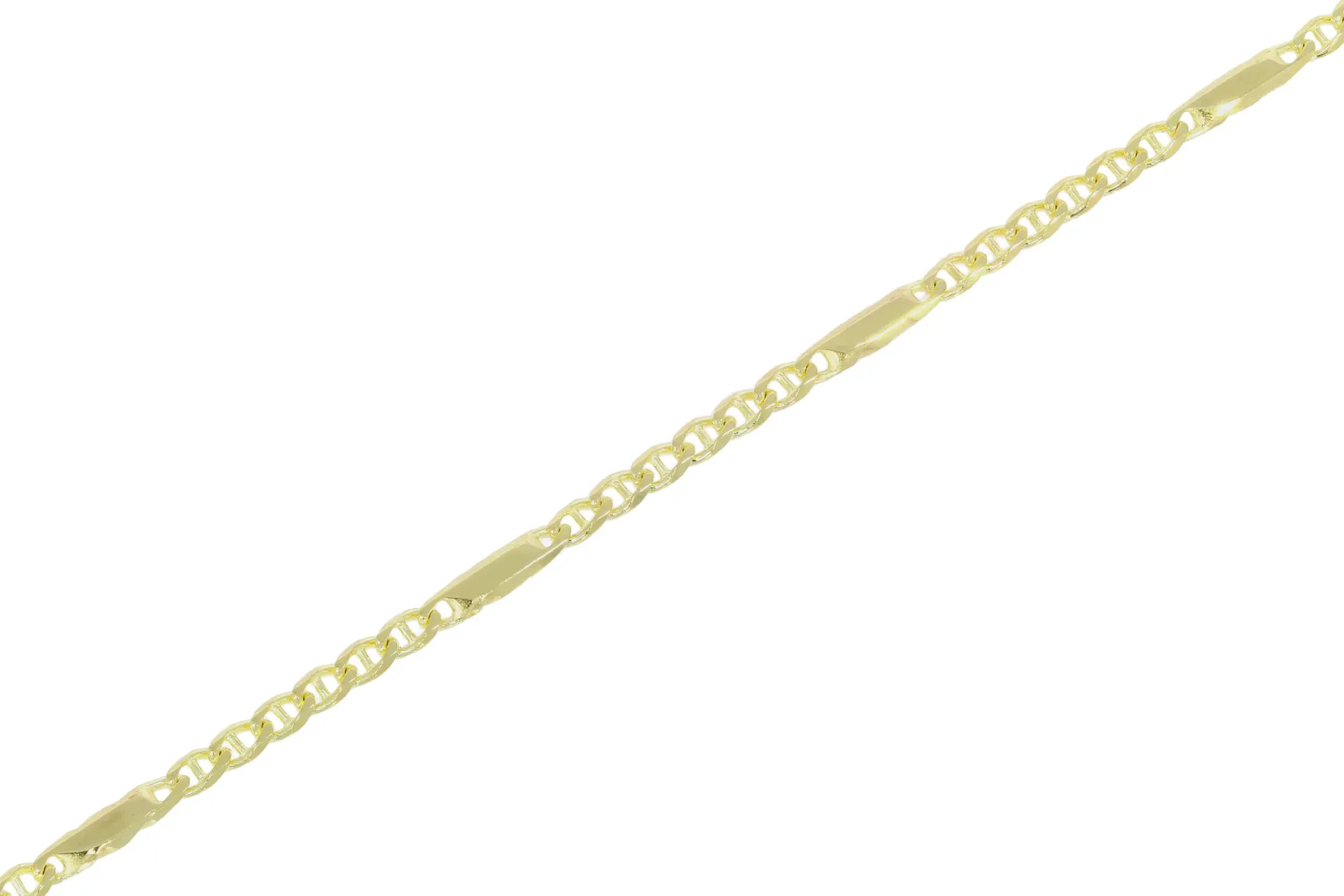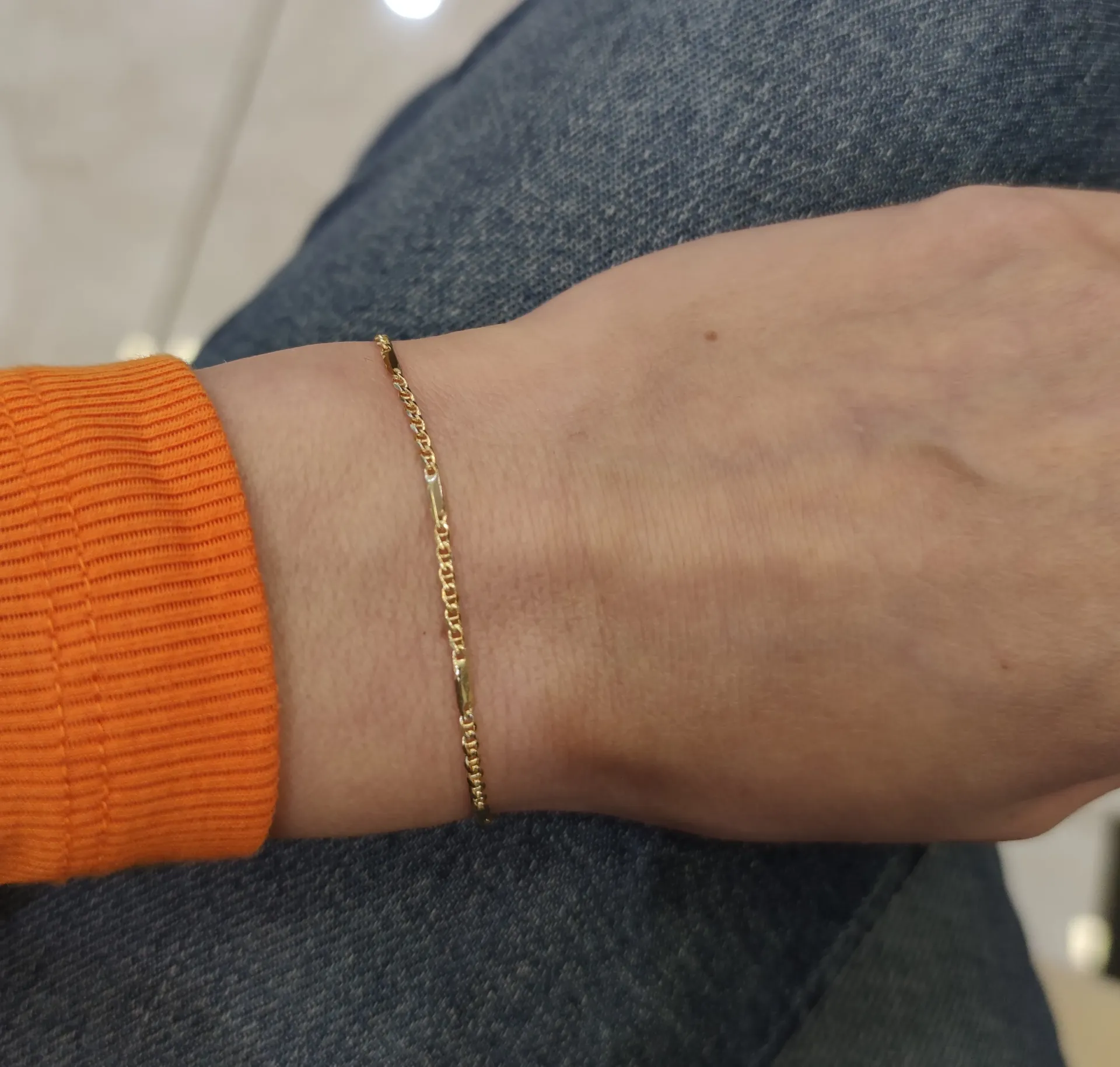 Zlatý náramok z plných očiek zdobí niekoľko dielov pripomínajúcich drobné platničky.