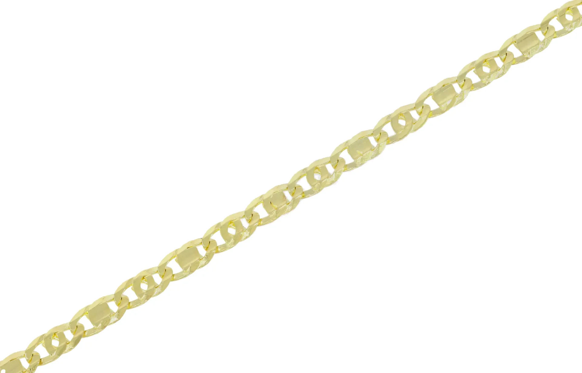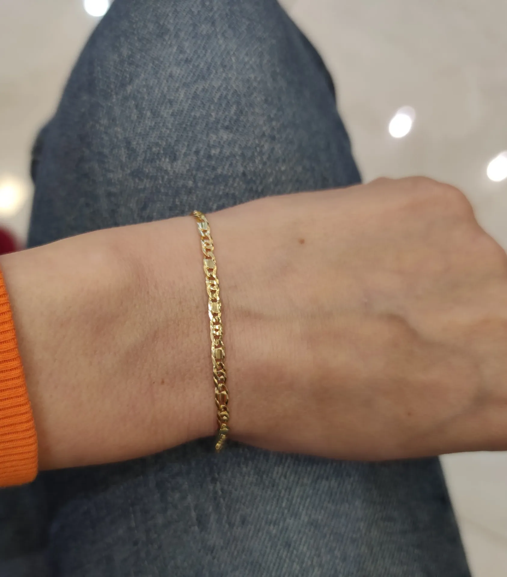 Elegantný zlatý náramok je tvorený kombináciou prepletaných očiek a očiek s drobnými platničkami. Všetky očká náramku sú plné.