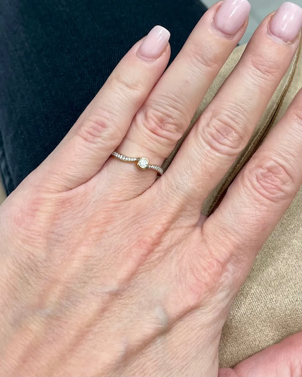 Nádherný zlatý prsteň zdobený prírodnými diamantmi v celkovej váhe 0,16ct. Šperk je vyrobený zo žltého a bieleho 14 karátového zlata a patrí k nemu tiež certfifikát potvrdzujúci pravosť diamantov.