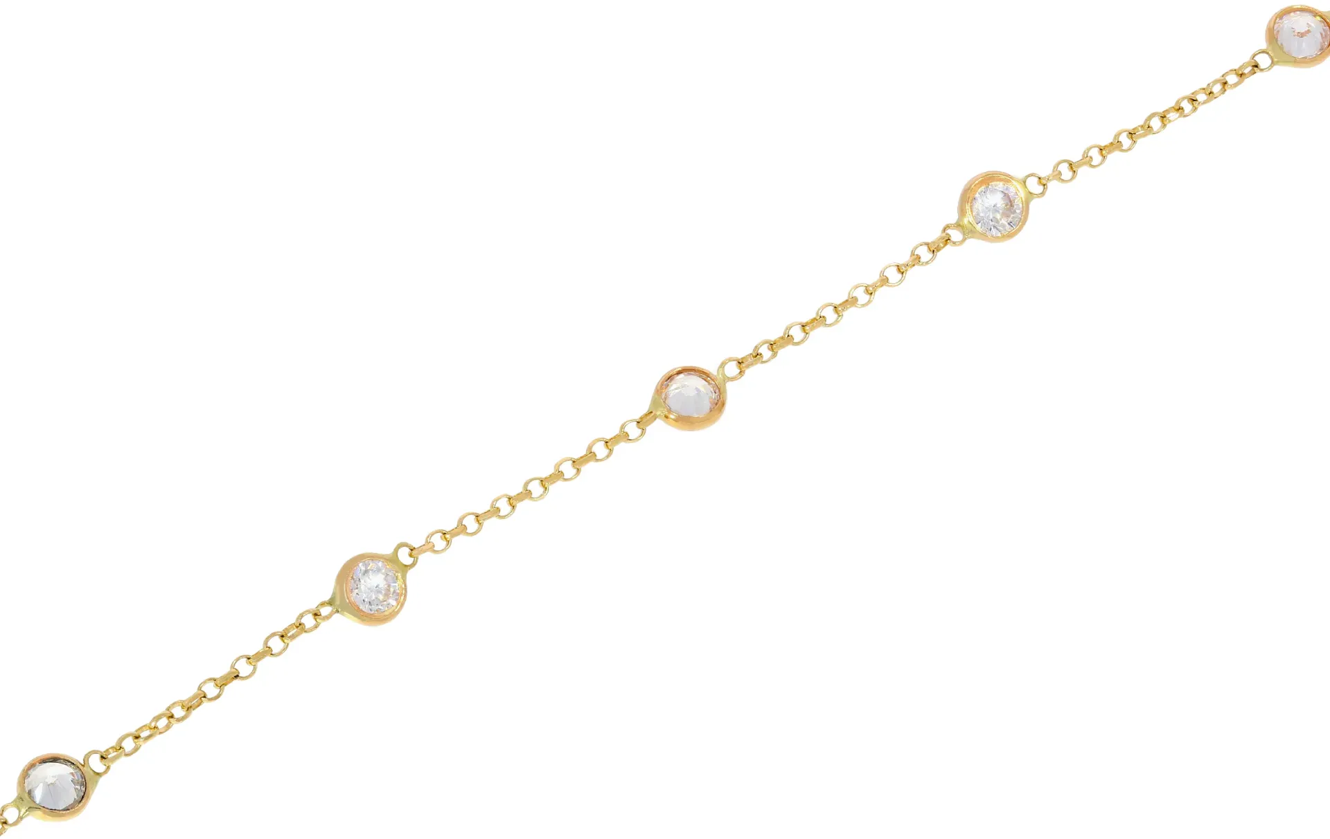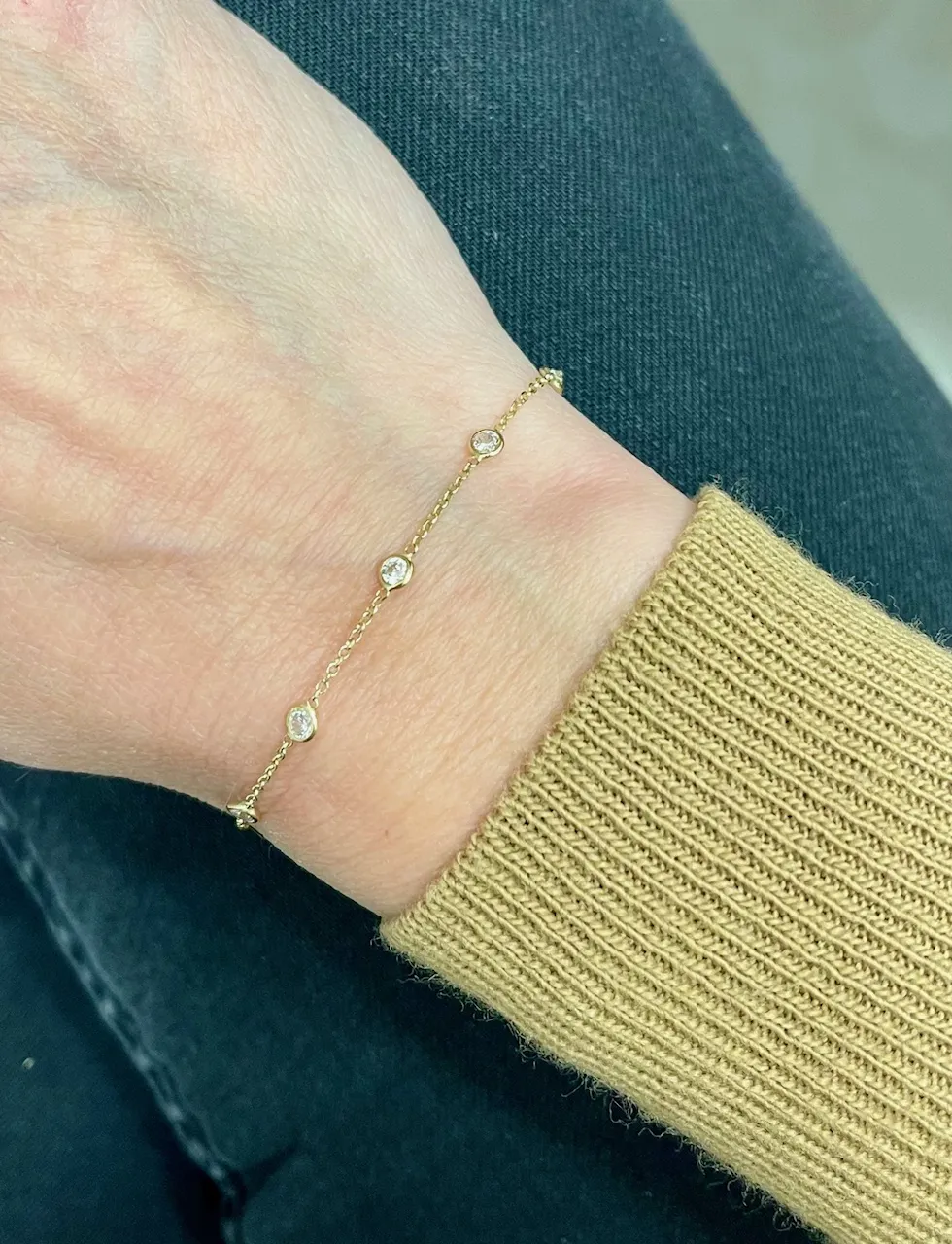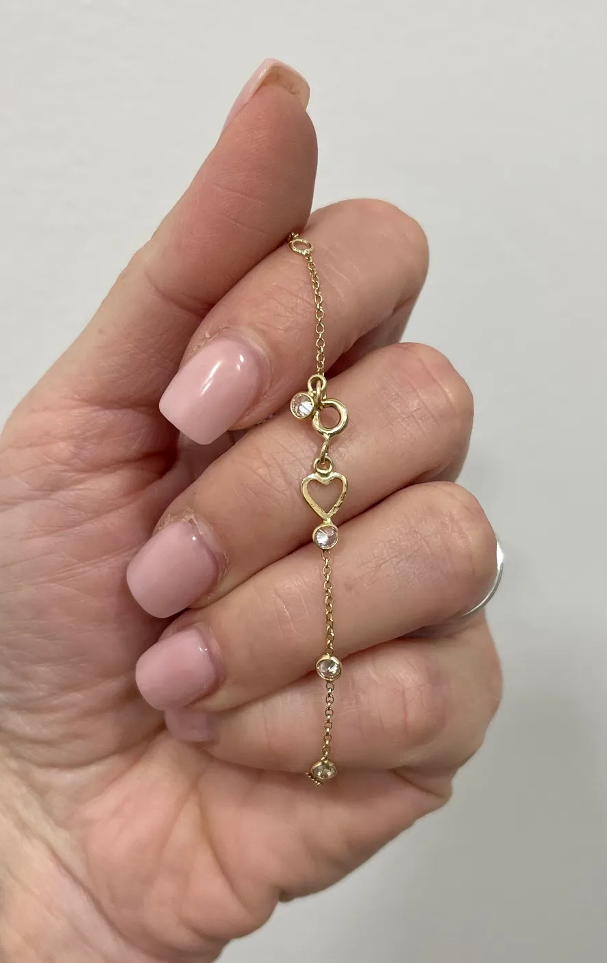Krásny zlatý náramok zdobí okrem 9 okrúhlych zirkónov aj srdiečko uchytené pri uzávere náramku. Náramok je vyrobený zo žltého 14k zlata a jeho dĺžka je regulovateľná na 15cm alebo 17cm. Zapínanie má tvar pérového krúžku.