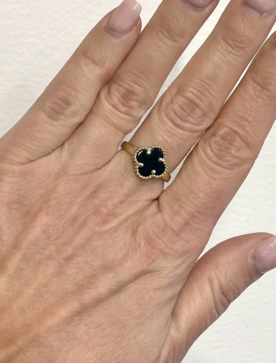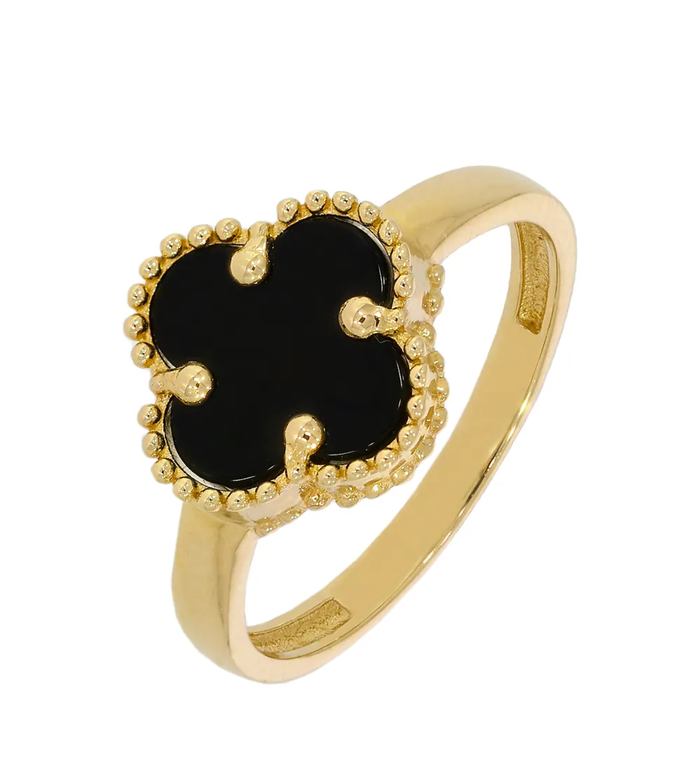 Krásny zlatý prsteň s mimoriadne obľúbeným motívom čierneho štvorlístka s čipkovaným lemom.