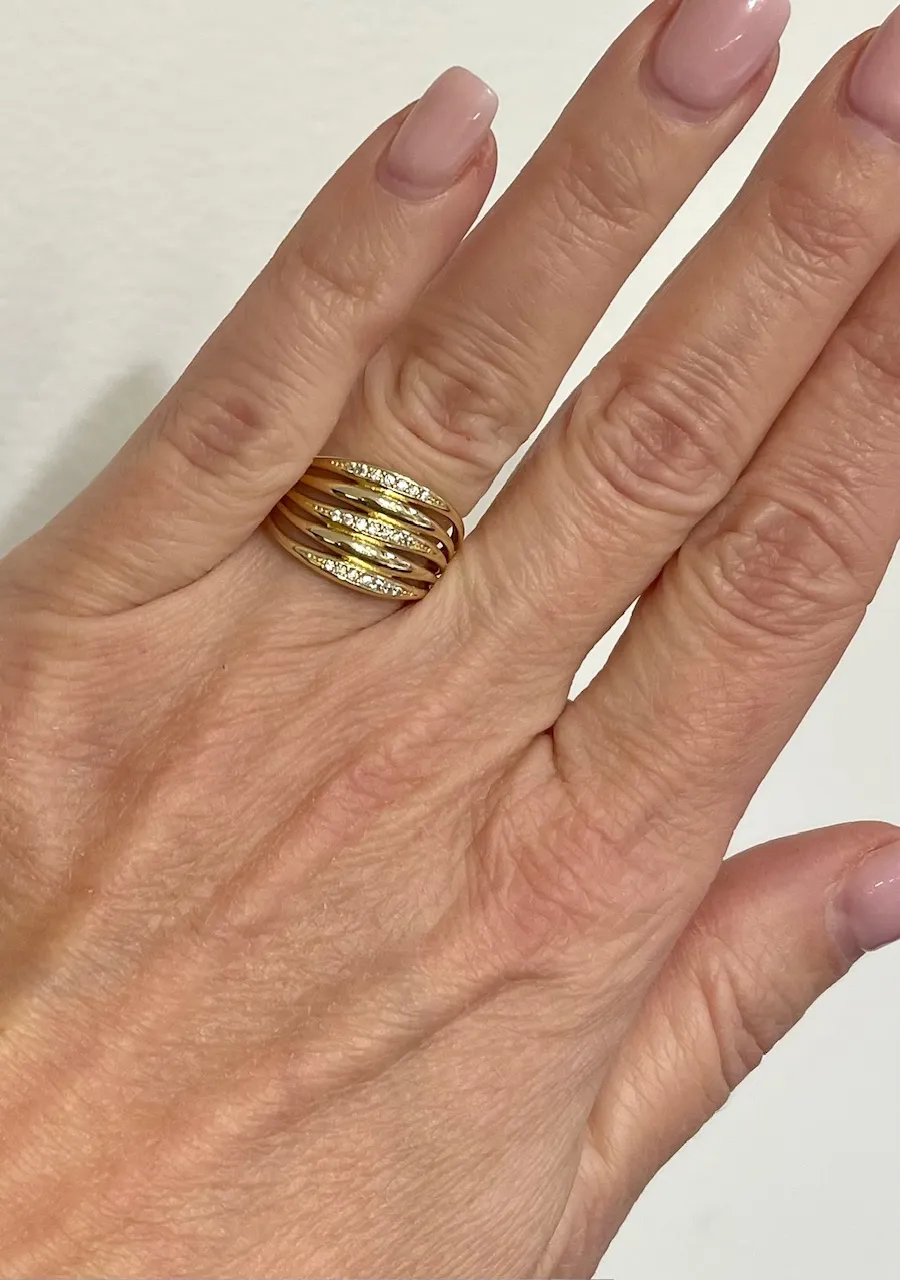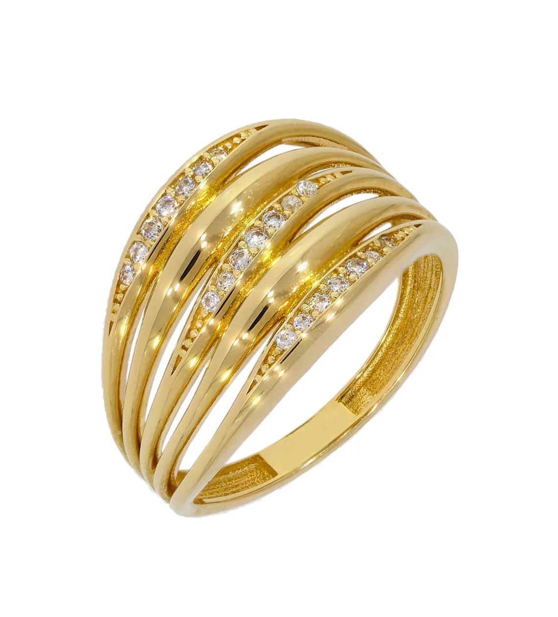 Krásny zlatý prsteň určený pre dámy je vyrobený zo žltého 14 karátového zlata, má lesklú povrchovú úpravu a zdobia ho biele zirkóny.