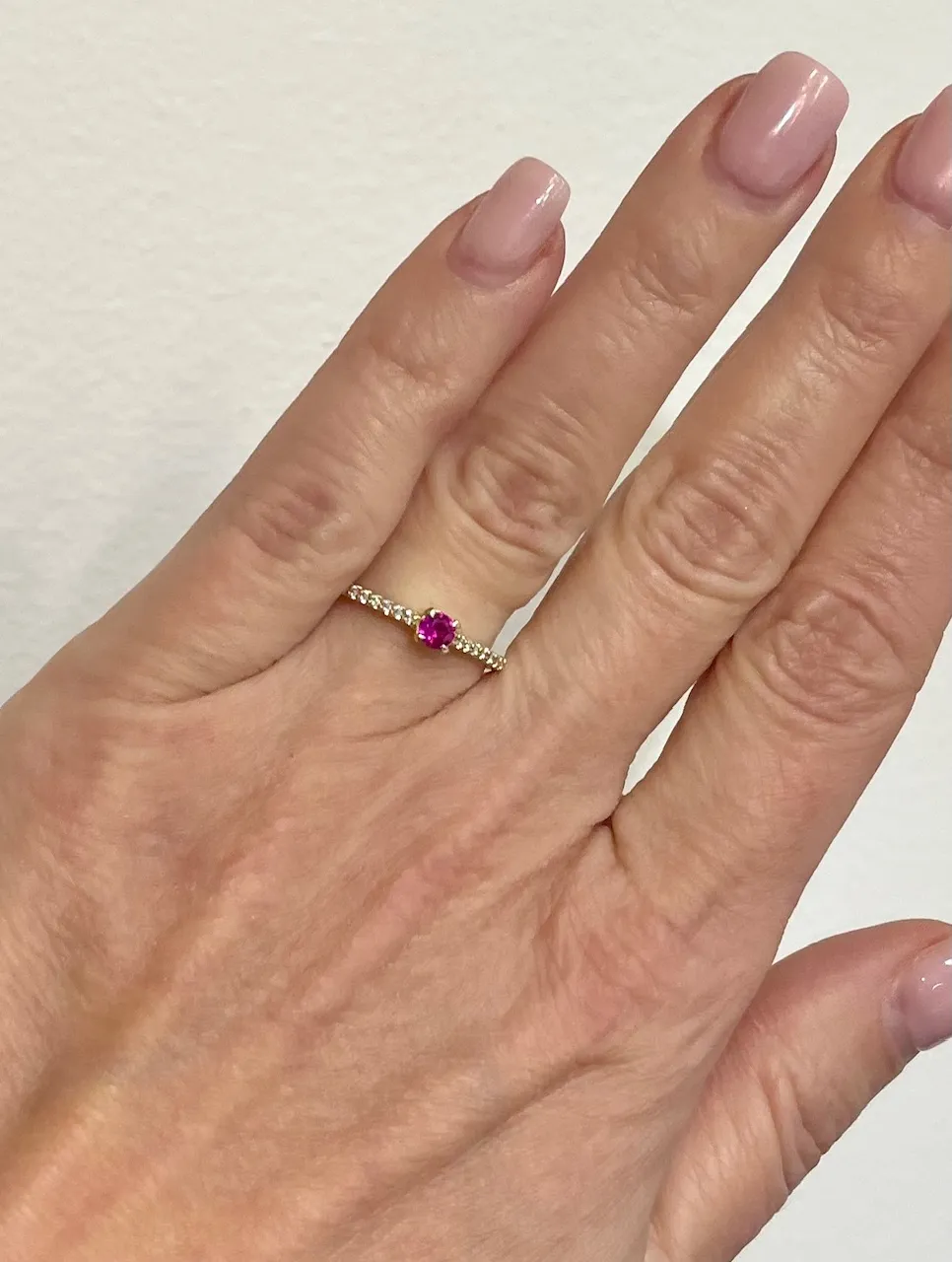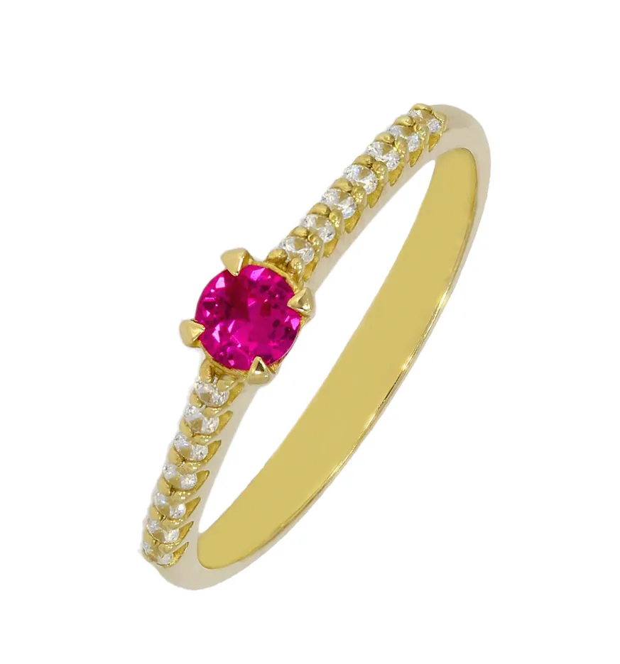 Skutočne krásny zlatý prsteň zdobí dominantný cyklámenový zirkón v centrálnej časti, ktorý po stranách dopĺňajú malé biele zirkóny.