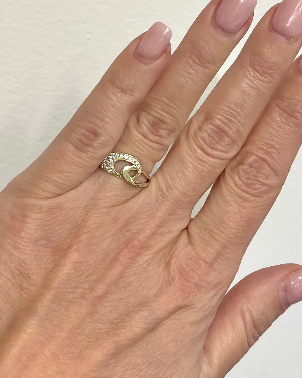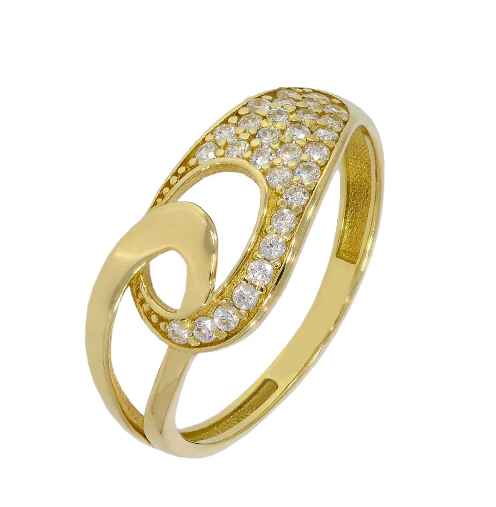 Pekný zlatý prsteň zdobený množstvom bielych zirkónov je vyrobený zo žltého 14k zlata.