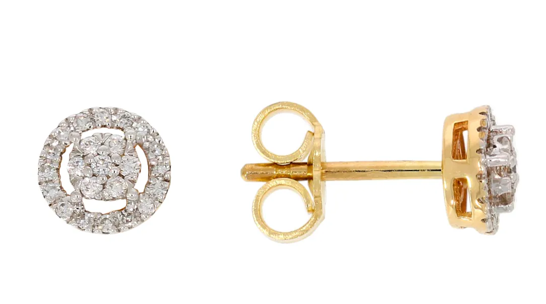 Krásne diamantové náušnice zdobené prírodnými diamantmi v celkovej váhe 0,13ct. Náušnice sú vyrobené kombináciou žltého a bieleho 14 karátového zlata a dokonale doladia každý outfit. K šperku patrí tiež certifikát potvrdzujúci pravosť diamantov.