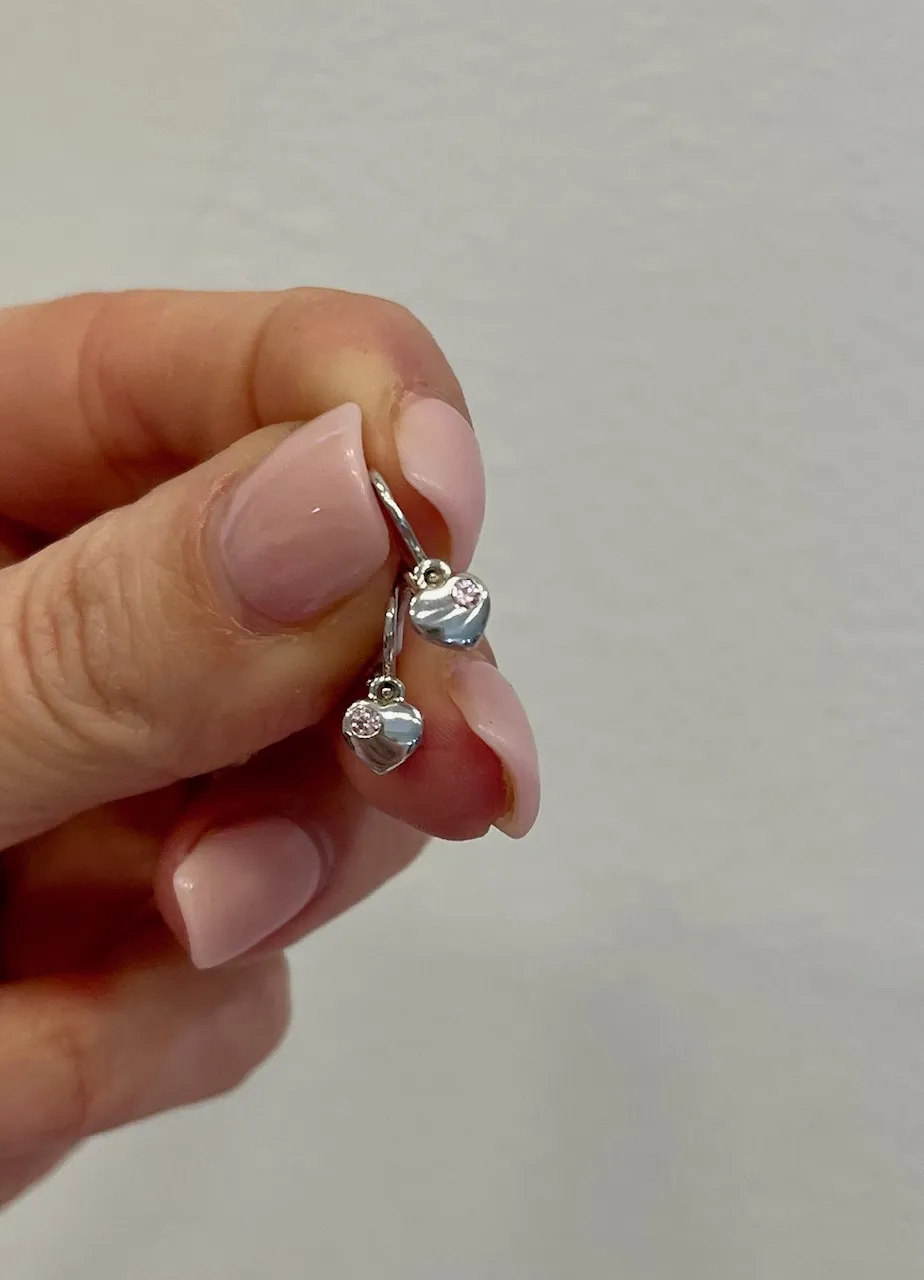 Krásne srdiečkové náušnice vyrobené z bieleho 14k zlata majú lesklý povrch a zdobia ich ružové zirkóny. Vhodné sú aj ako darček, napríklad aj na krstiny.