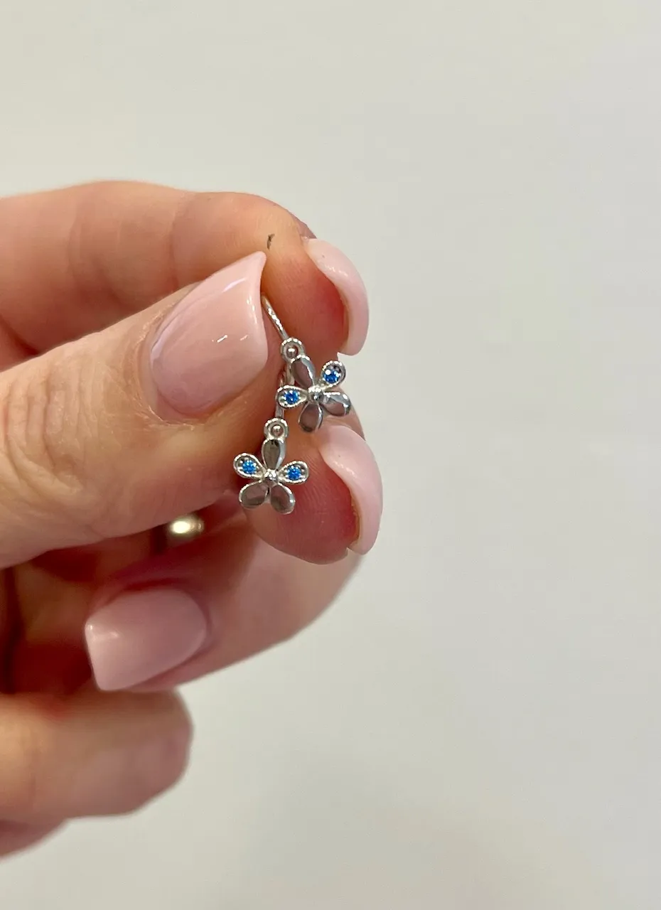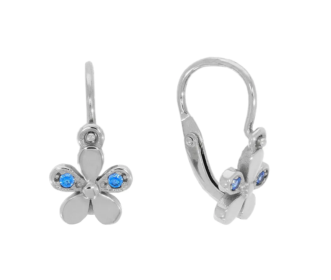Krásne prepracované detské náušnice z bieleho zlata vyrobené v tvare kvetinky. Dizajn šperku dotvárajú modré zirkóny. Náušnice majú bezpečné zapínanie spredu a sú vhodné pre dievčatká už od narodenia.