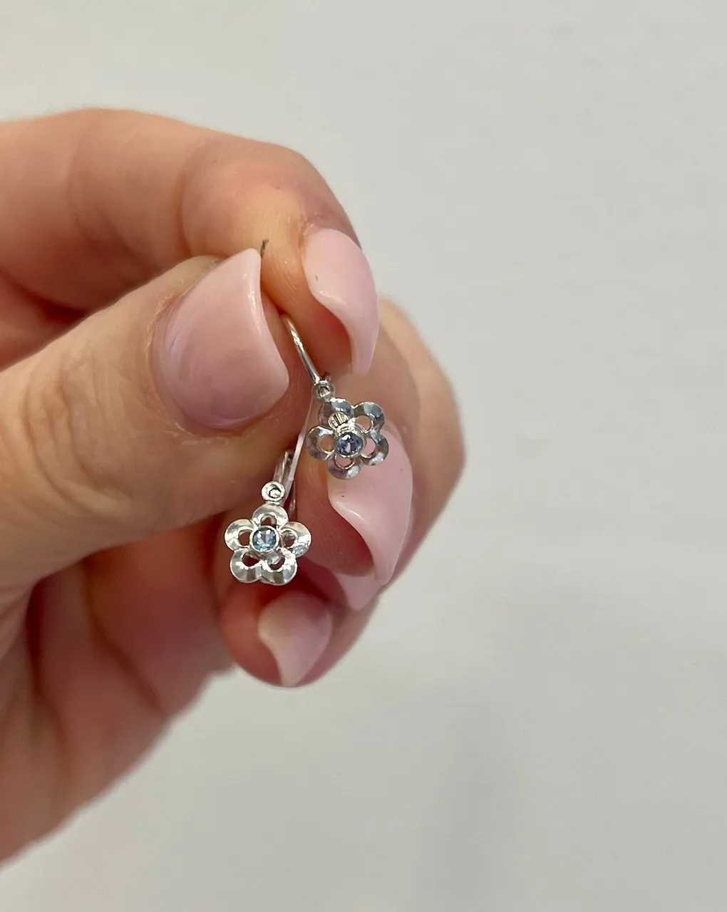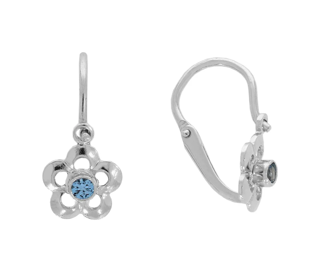 Skutočne veľmi pekné, prepracované náušnice z bieleho zlata vyrobené v tvare kvetiny. Modrý zirkón uchytený v centrálnej časti šperku dotvára jeho celkový dizajn. Náušnice sú vďaka bezpečnému zapínaniu spredu vhodné už od narodenia.