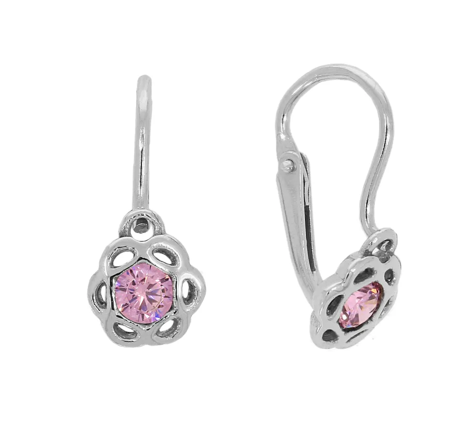 Náušnice z bieleho zlata vyrobené v tvare kvetiny zdobia ružové zirkóny.