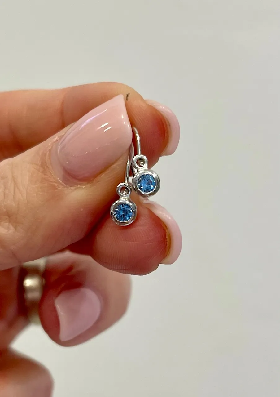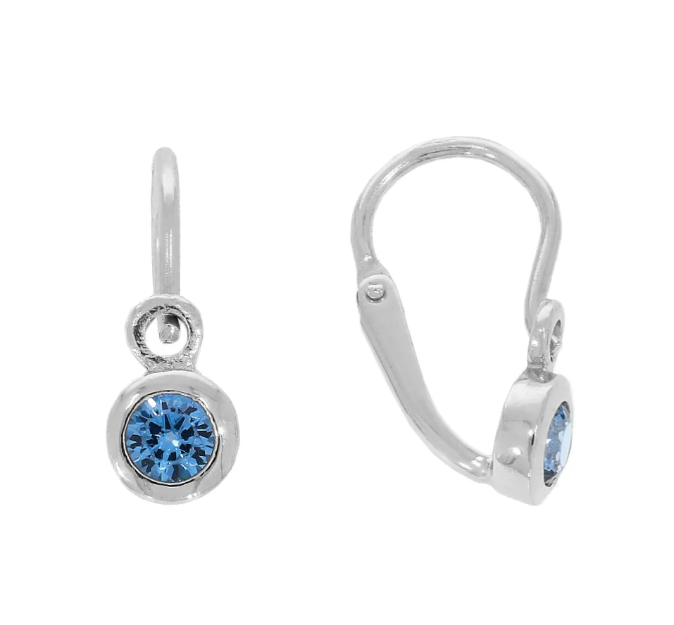 Krásne detské náušnice z bieleho zlata zdobia dominantné modré zirkóny. Náušnice majú lesklú povrchovú úpravu a sú vhodné už od narodenia.