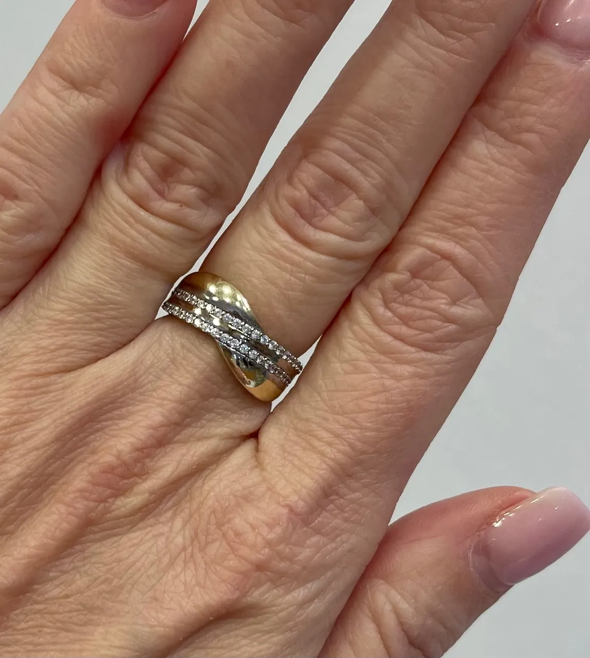 Krásny zlatý prsteň s lesklou povrchovou úpravou je zdobený bielymi zirkónmi a bielym tónovaním zlata.