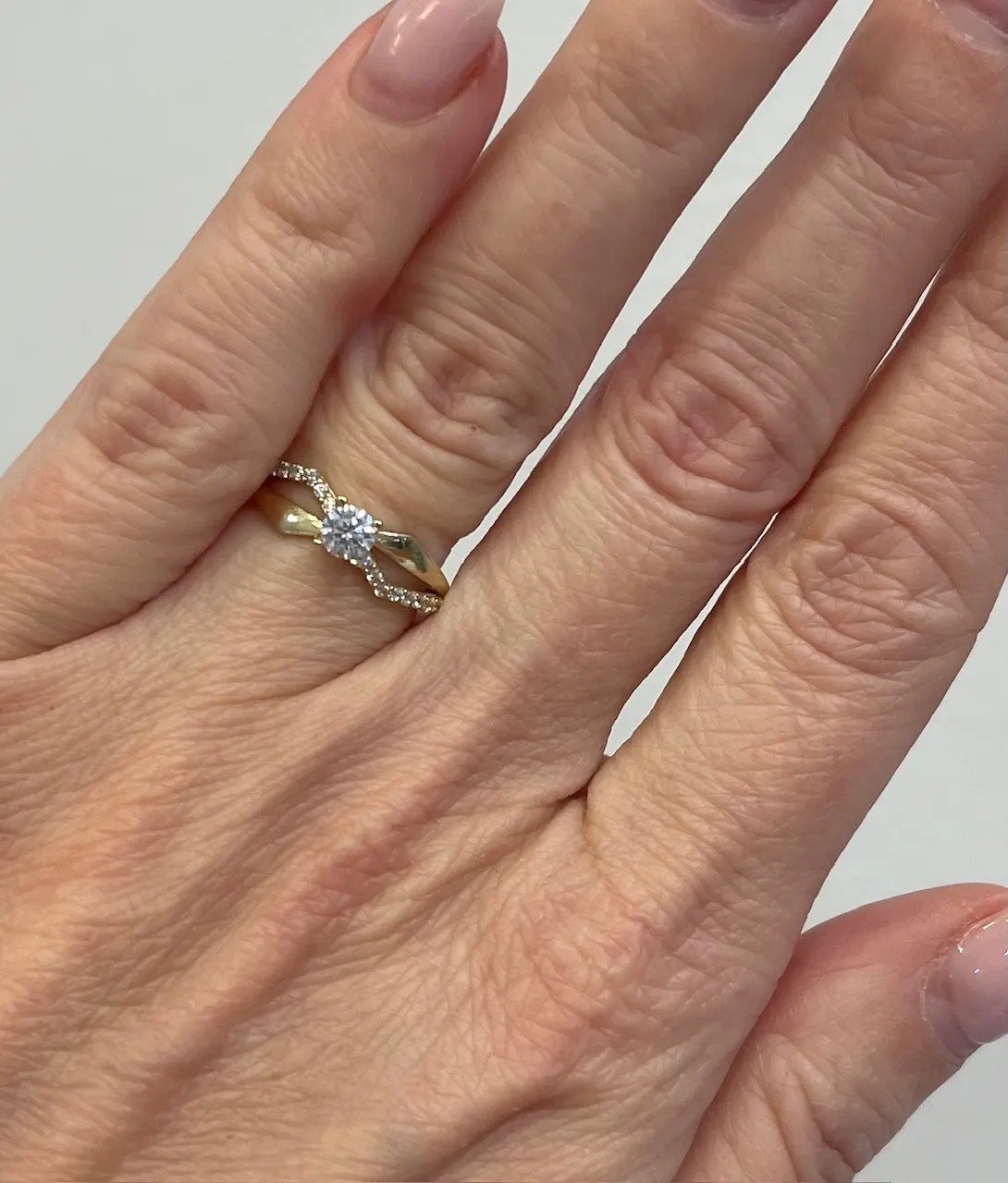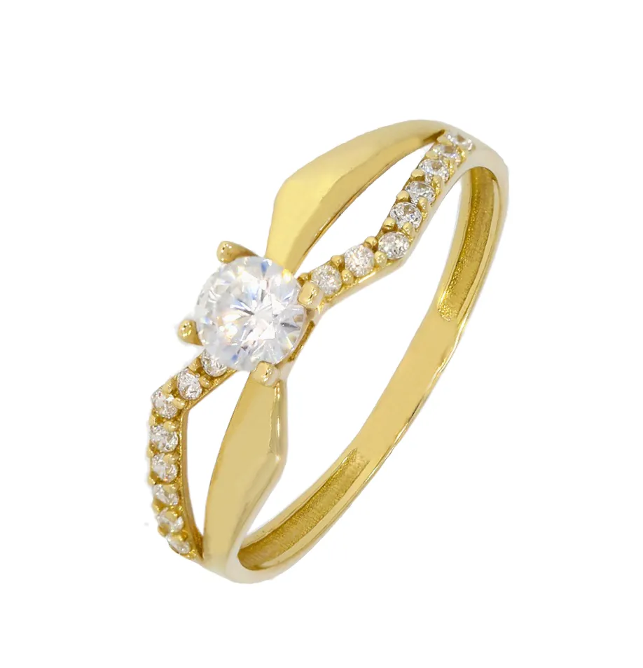 Prsteň zdobený bielymi zirkónmi vyrobený zo žltého 14 karátového zlata s lesklou povrchovou úpravou.