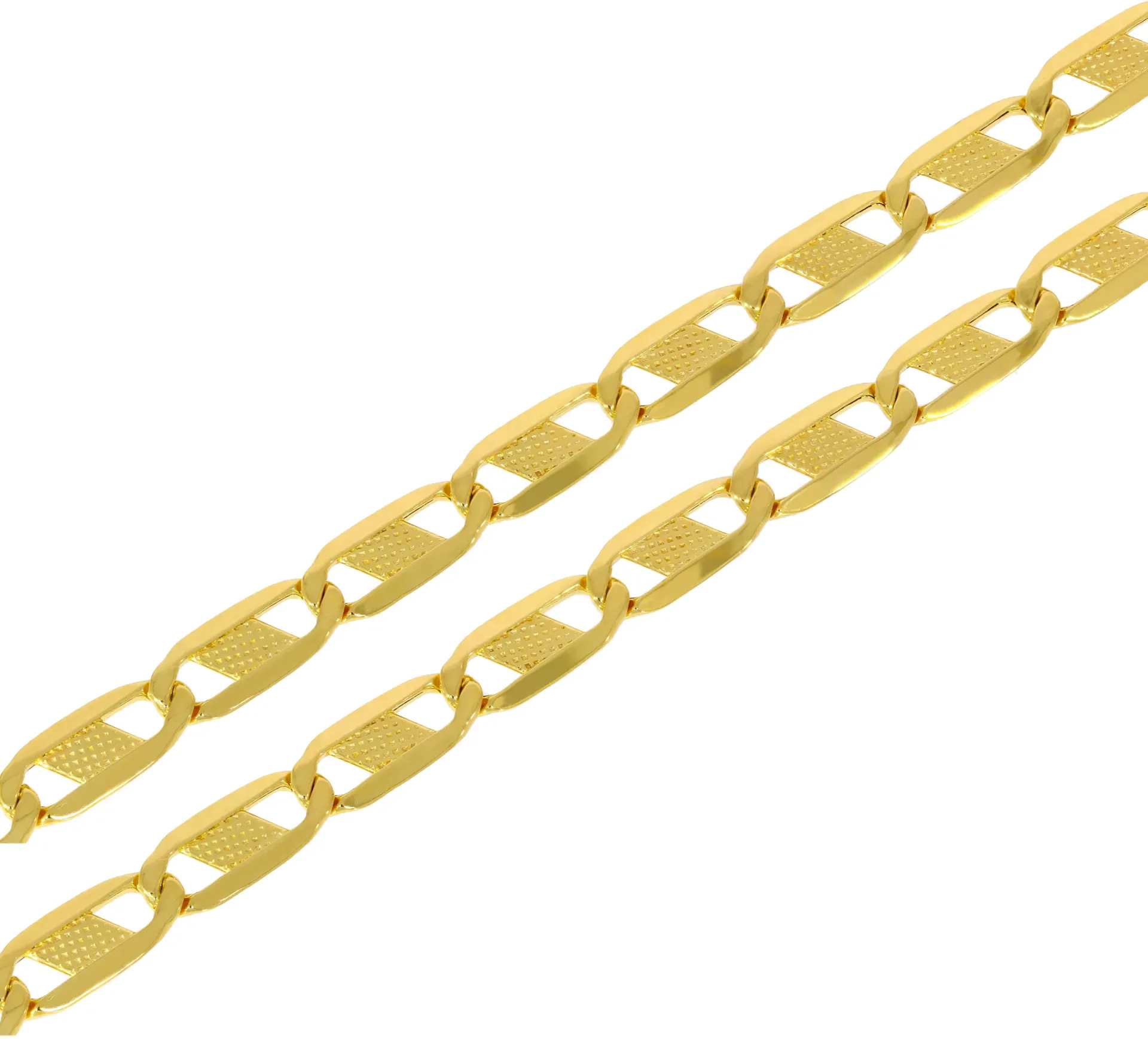 Zlatá retiazka má podlhovasté očká zdobené šikmými platničkami s gravírovaným vzorom.