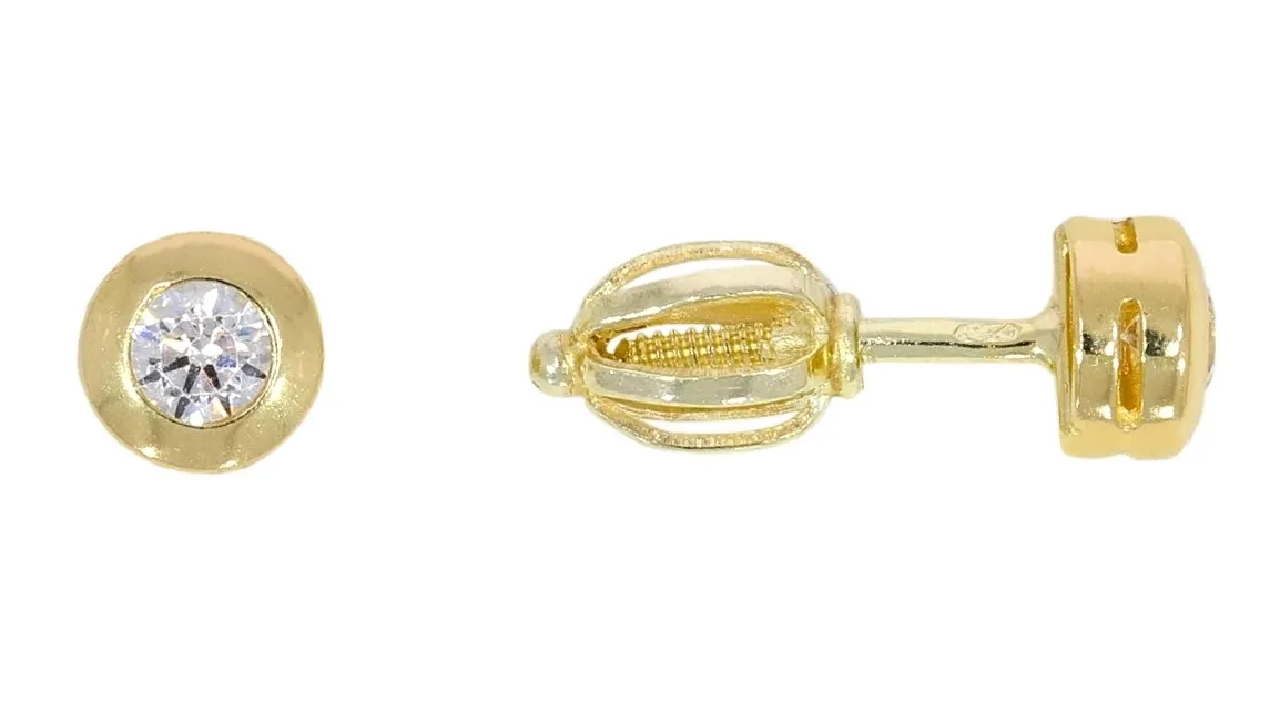 Pekné náušnice zo žltého zlata zdobené bielym okrúhlym zirkónom majú lesklú povrchovú úpravu a bezpečné šrobovacie zapínanie.