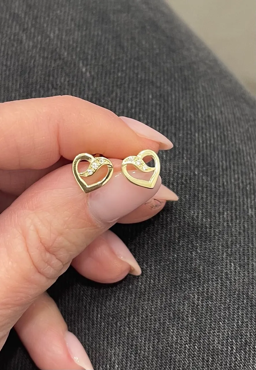 Krásne náušnice vyrobené zo žltého 14k zlata v tvare srdiečok sú zdobené bielymi zirkónmi. Náušnice majú šrobovacie zapínanie.