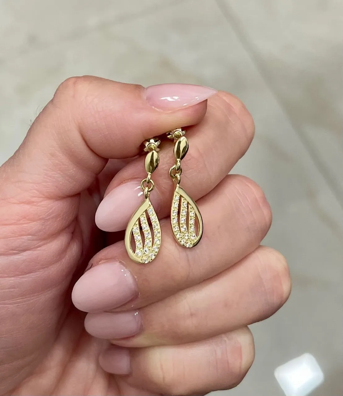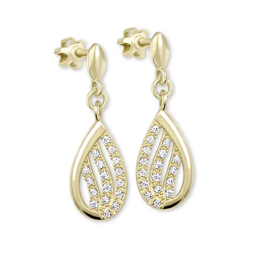 Krásne náušnice vyrobené zo žltého 14k zlata majú bezpečné šrobovacie zapínanie a zdobí ich množstvo bielych zirkónov.