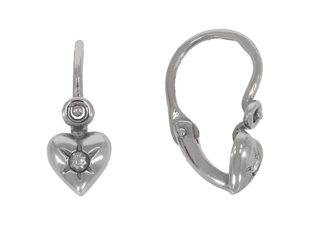 Pekné náušničky vyrobené z bieleho 14k zlata v tvare srdiečok zdobia biele zirkóny.