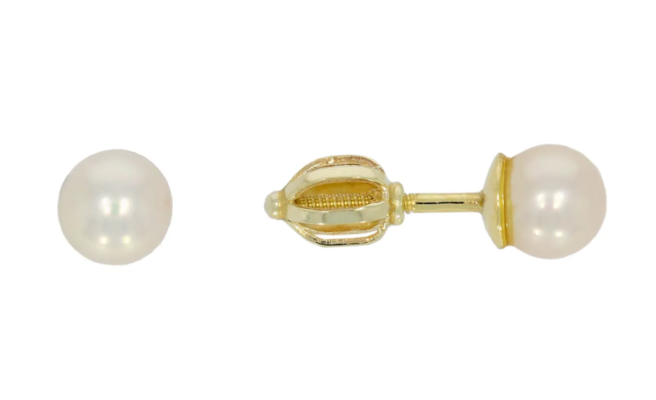 Perlové náušnice s bezpečným šrobovacím zapínaním sú vyrobené zo žltého 14 karátového zlata.