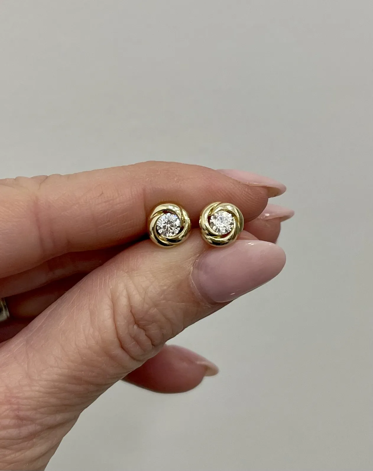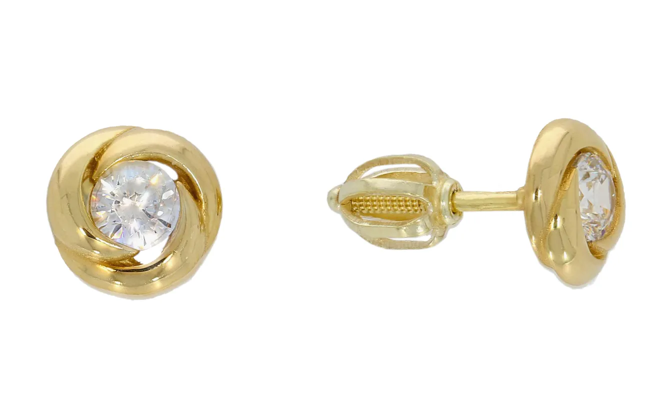 Krásne zlaté šrobovacie náušnice vyrobené v tvare uzlíka, ktorý dekoruje biely zirkón. Náušnice majú lesklú povrchovú úpravu a bezpečné šrobovacie zapínanie.