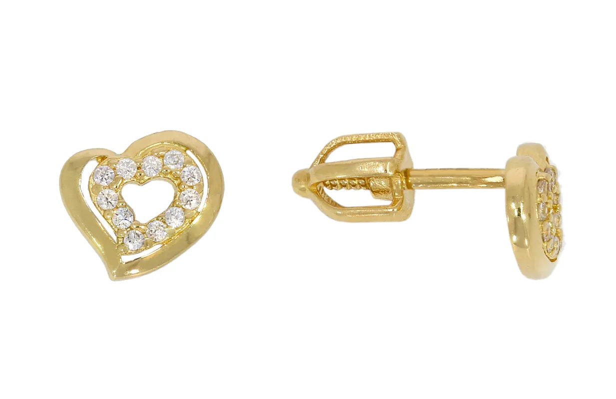 Krásne zlaté náušničky s bezpečným šrobovacím zapínaním sú vyrobené v tvare srdiečok zo žltého 14k zlata. Náušnice zdobia biele zirkóny a sú vhodné aj ako darček.