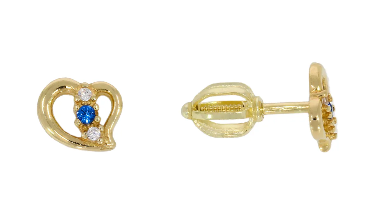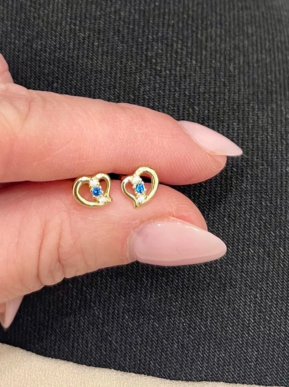 Pekné náušnice vyrobené v tvare srdiečok zo žltého 14k zlata. Náušnice zdobia biele a modré zirkóny, ktoré dotvárajú ich celkový dizajn. Náušnice majú bezpečné šrobovacie zapínanie.