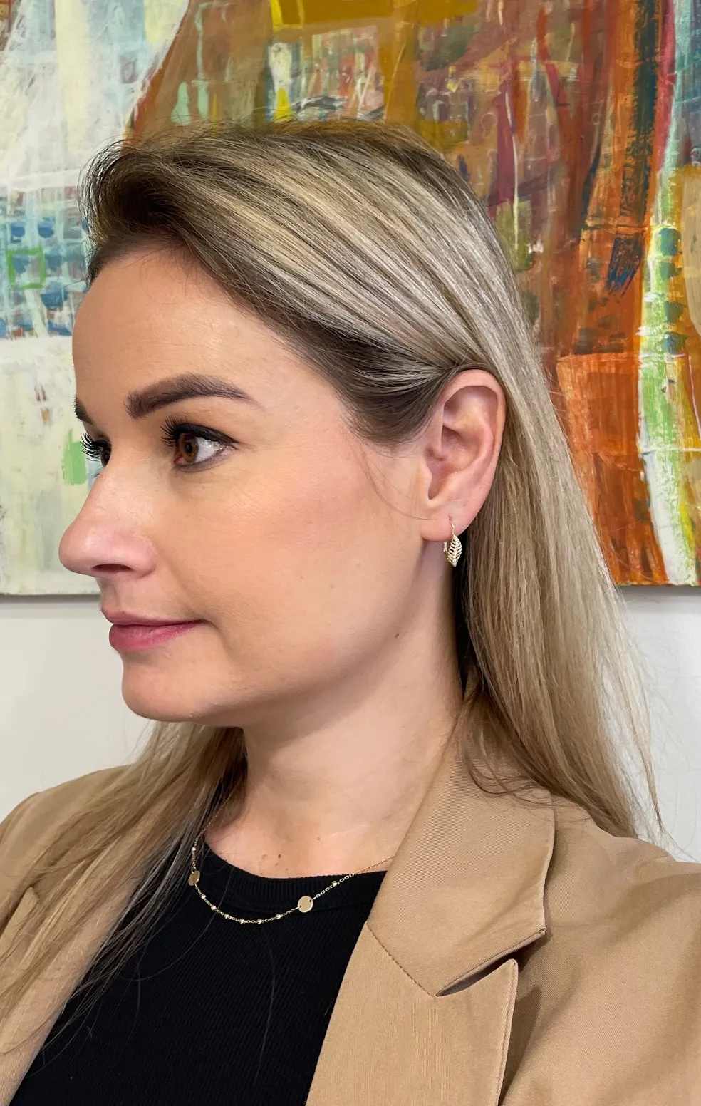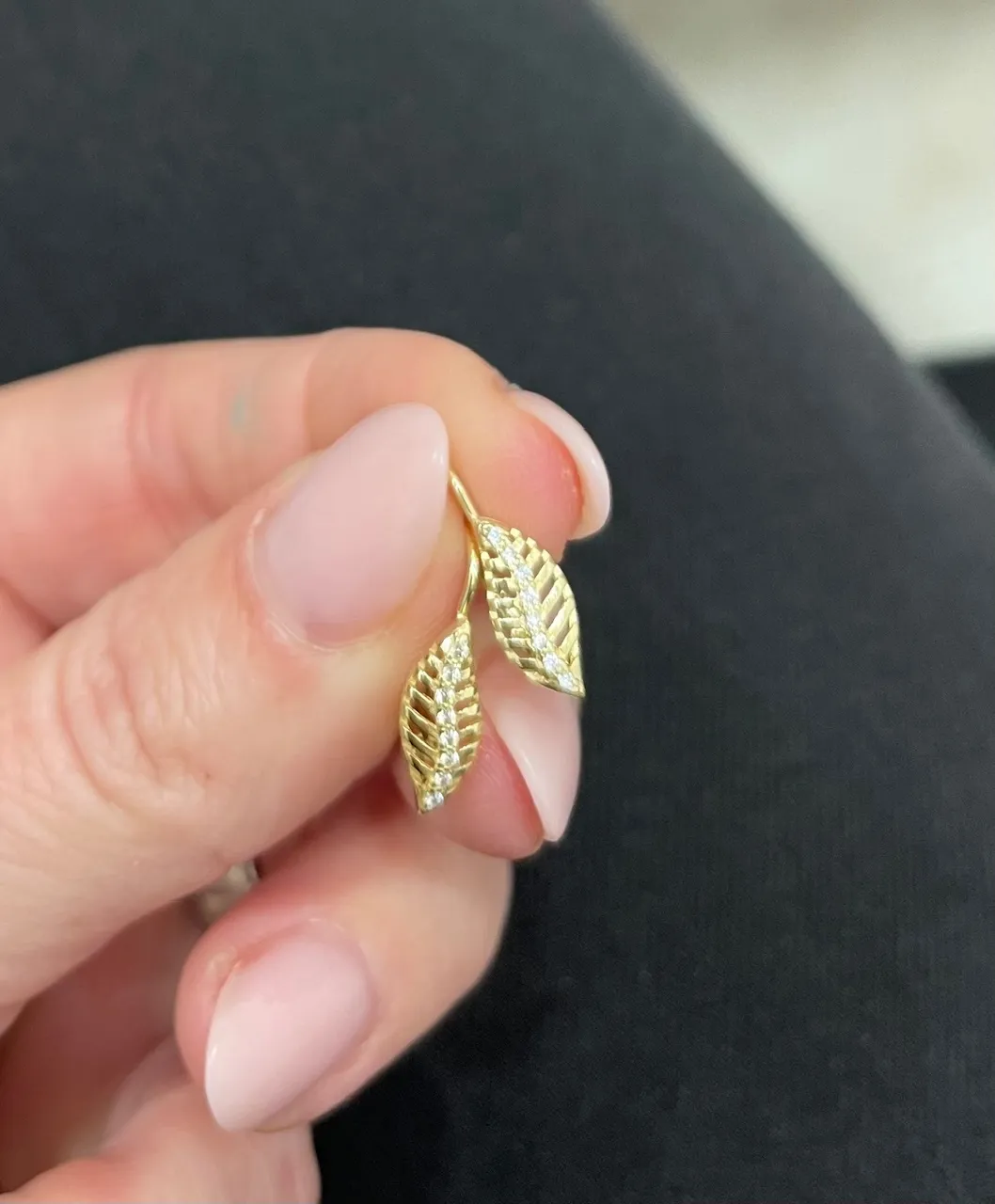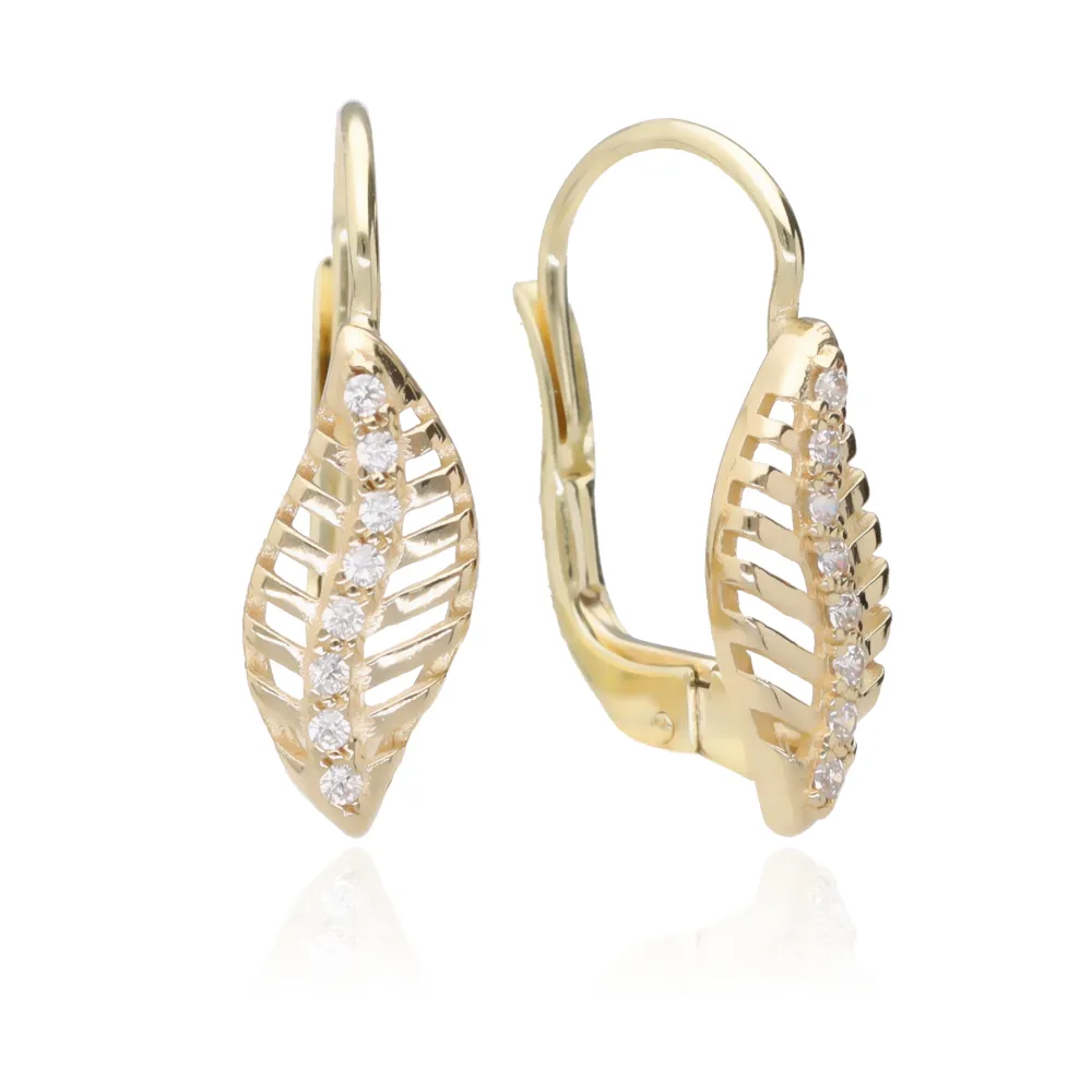 Pekné zlaté náušnice zdobené líniou bielych zirkónov vyrobené v tvare lístku.