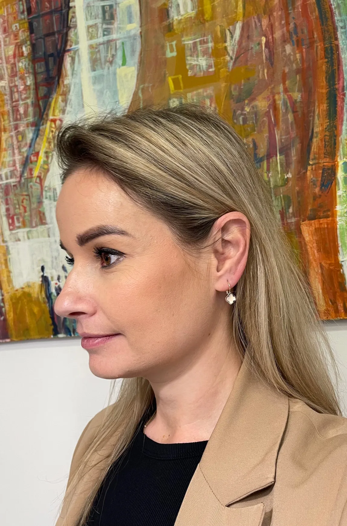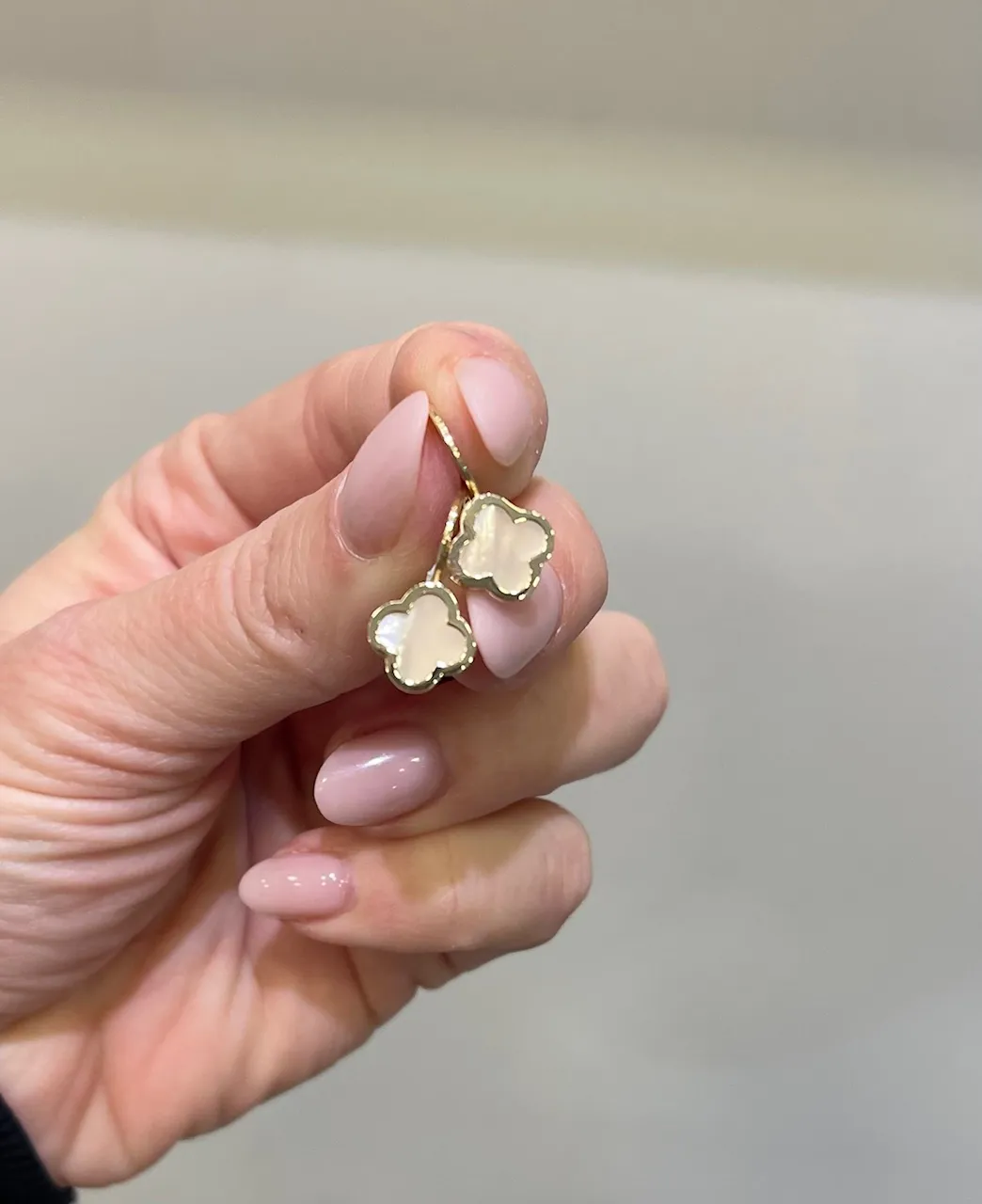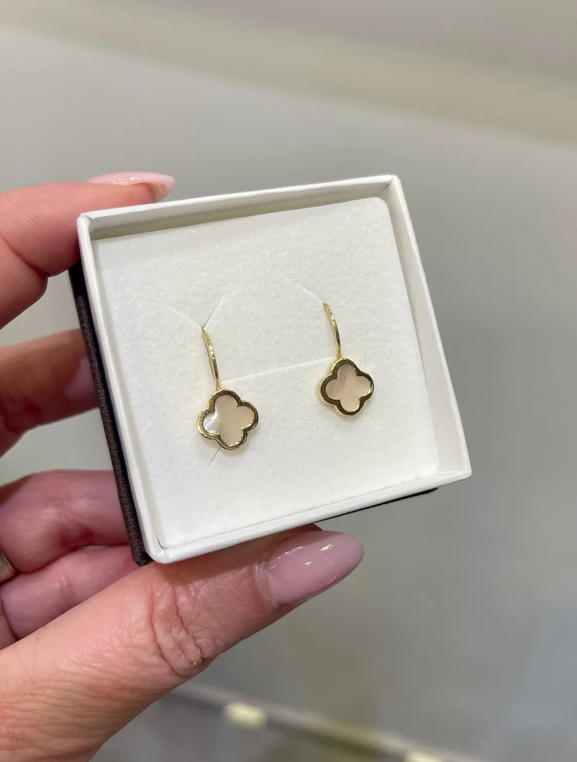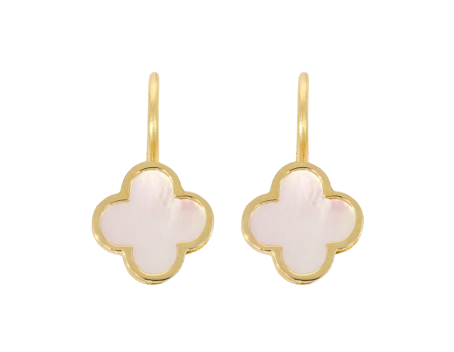 Moderné zlaté náušnice zdobí štvorlístkok s bielou perleťou s rozmerom 10 mm x 10 mm.