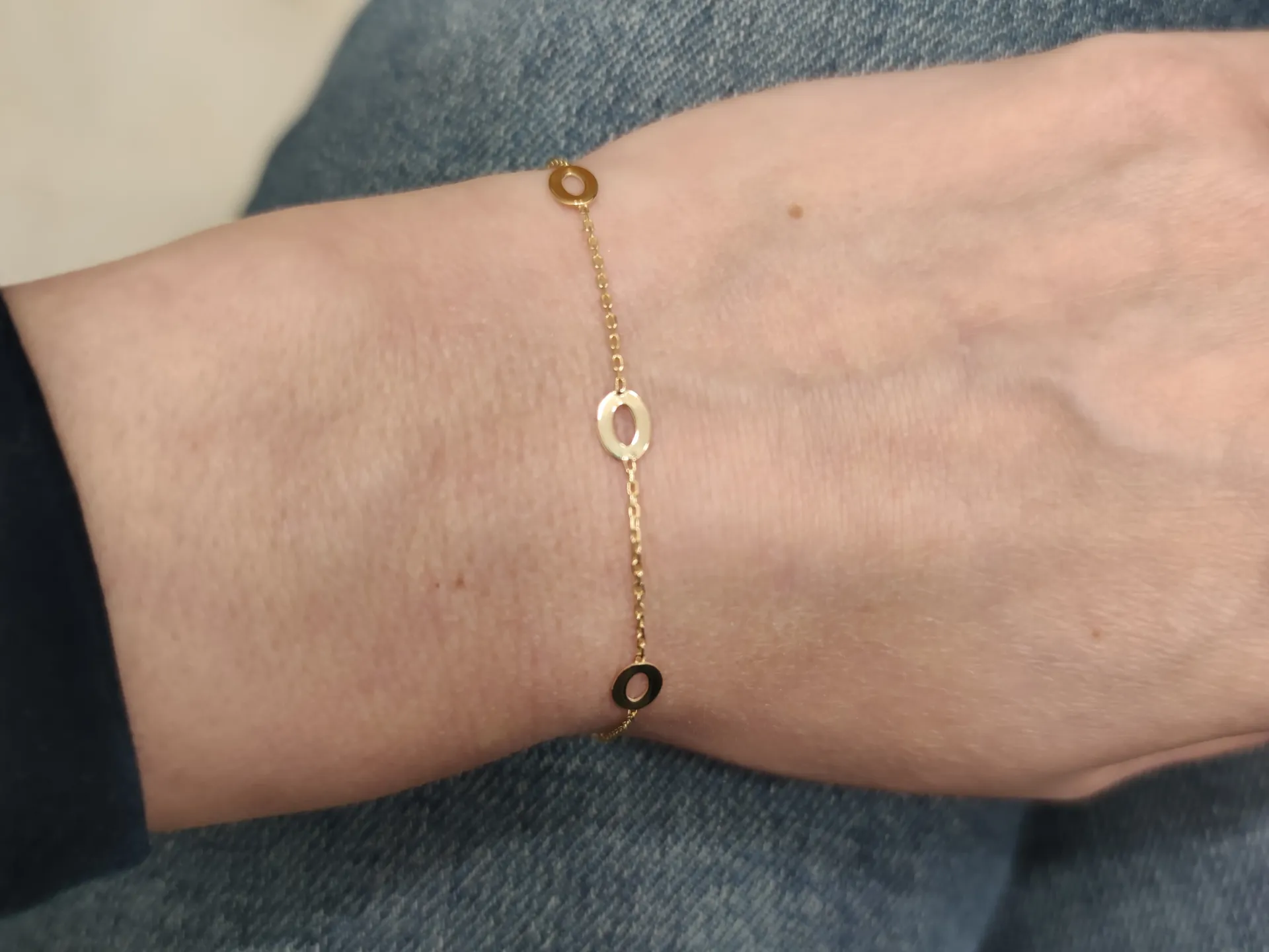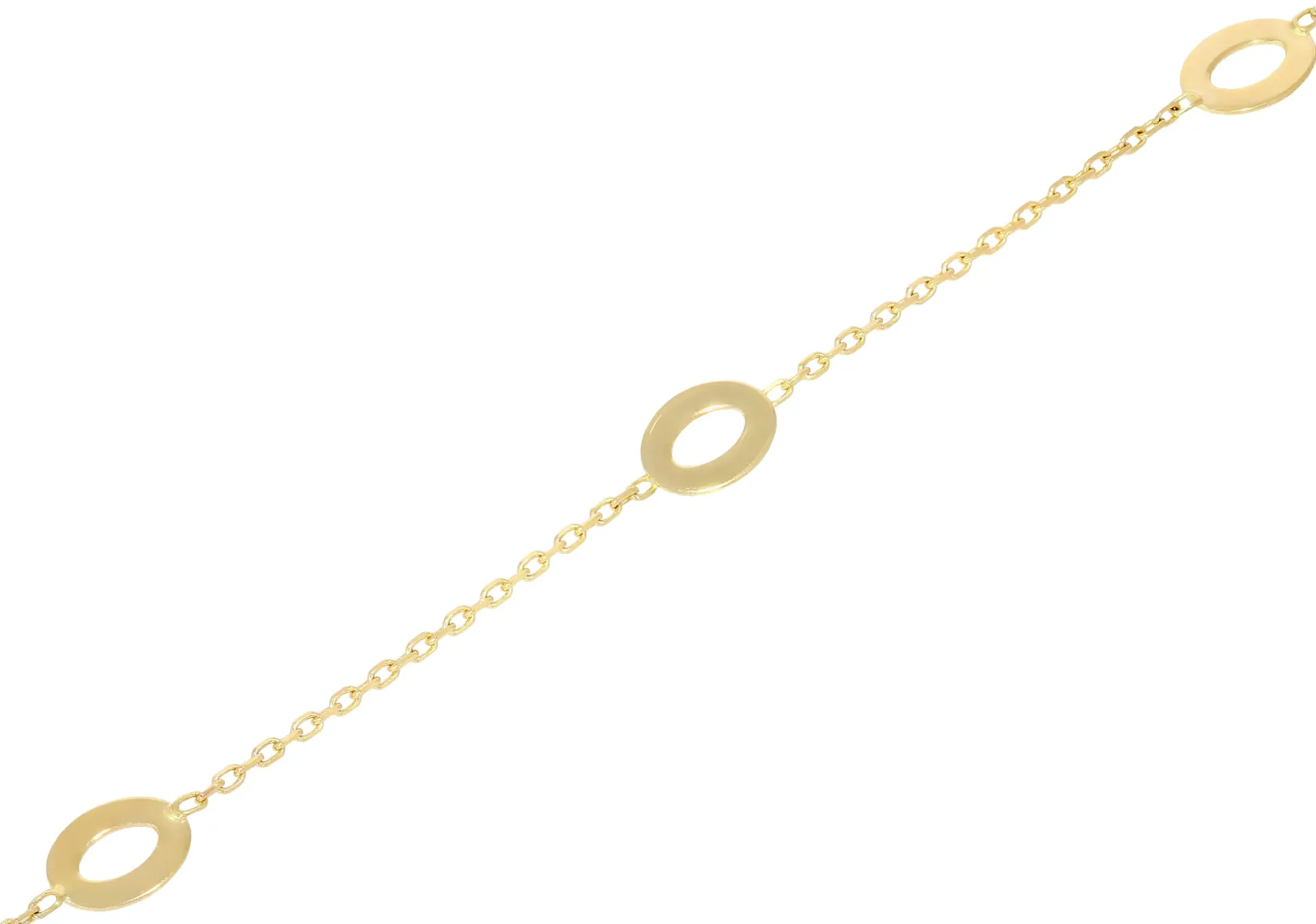Elegantný zlatý náramok zdobia jemné prívesky oválneho tvaru. Dĺžka náramku je nastaviteľná v rozmedzí 2,5 cm.