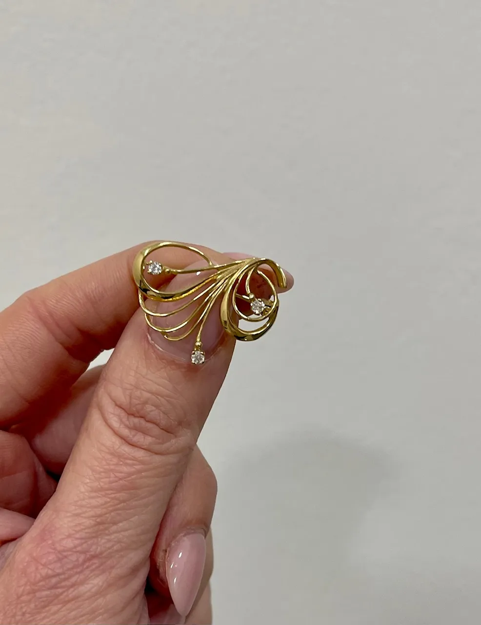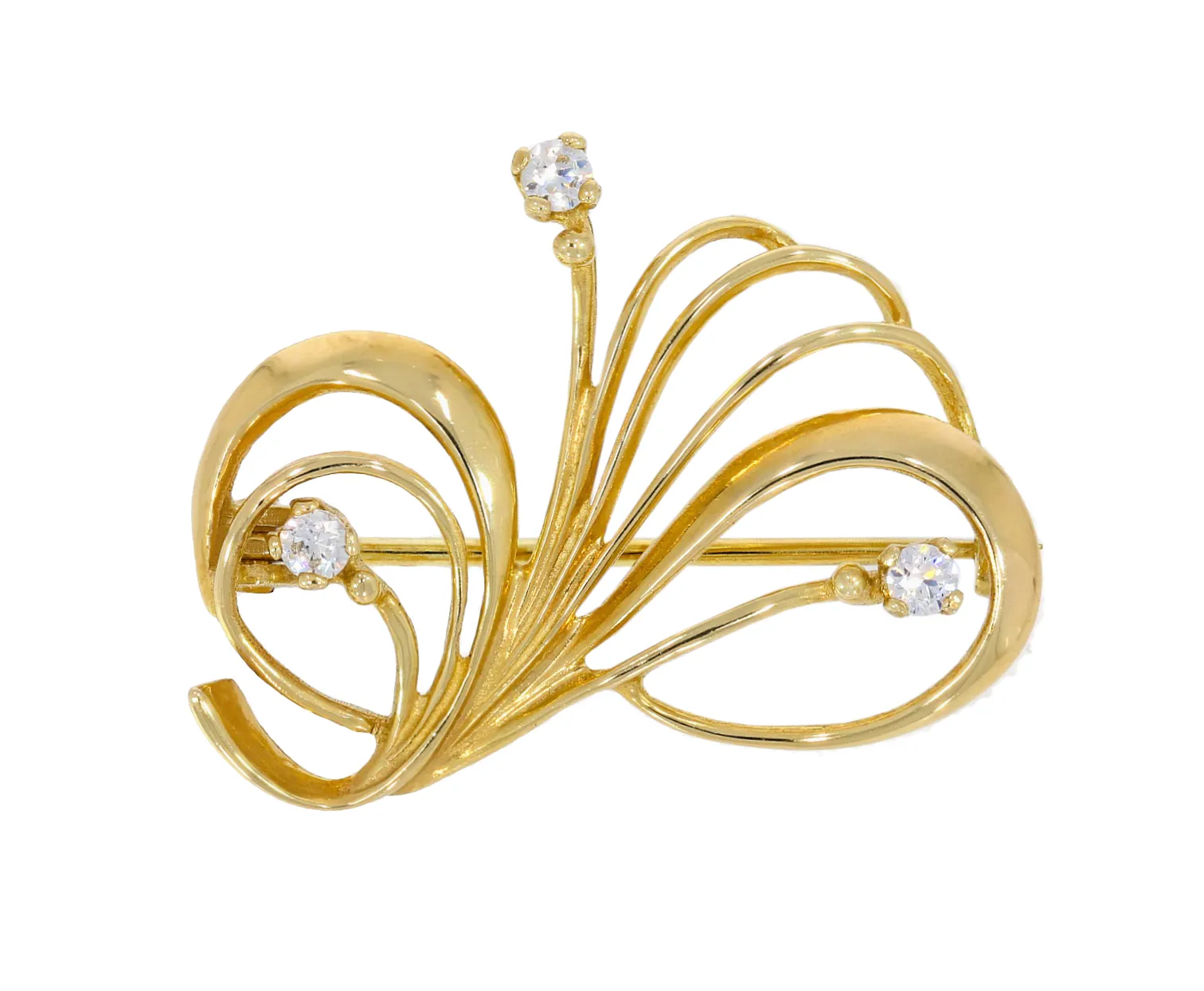 Pekná zlatá brošňa zdobená bielymi zirkónmi.