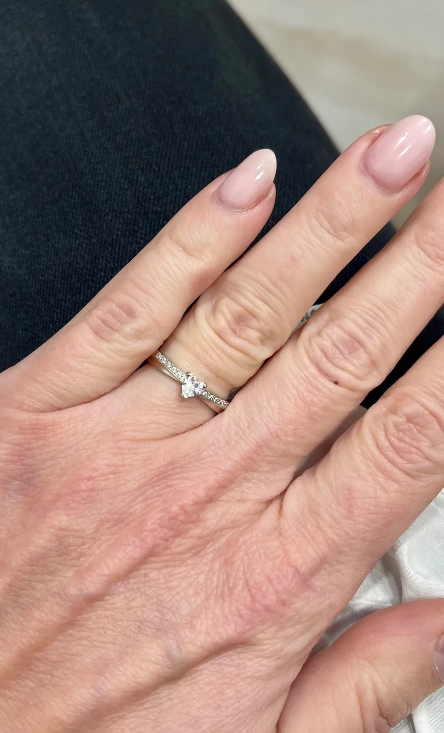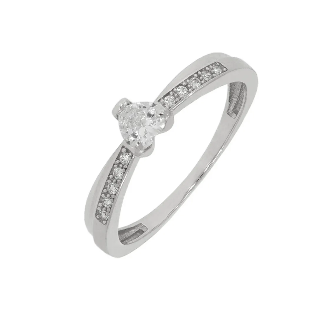 Krásny prsteň z bieleho 14k zlata zdobí srdiečkový zirkón v centrálnej časti, ktorý dopĺňajú línie bielych zirkónov.
