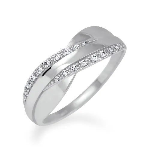 Elegantný prsteň z bieleho zlata zdobia drobné biele zirkóny. Kombinácia hladkého lesklého povrchu s kameňmi robí prsteň jedinečným.