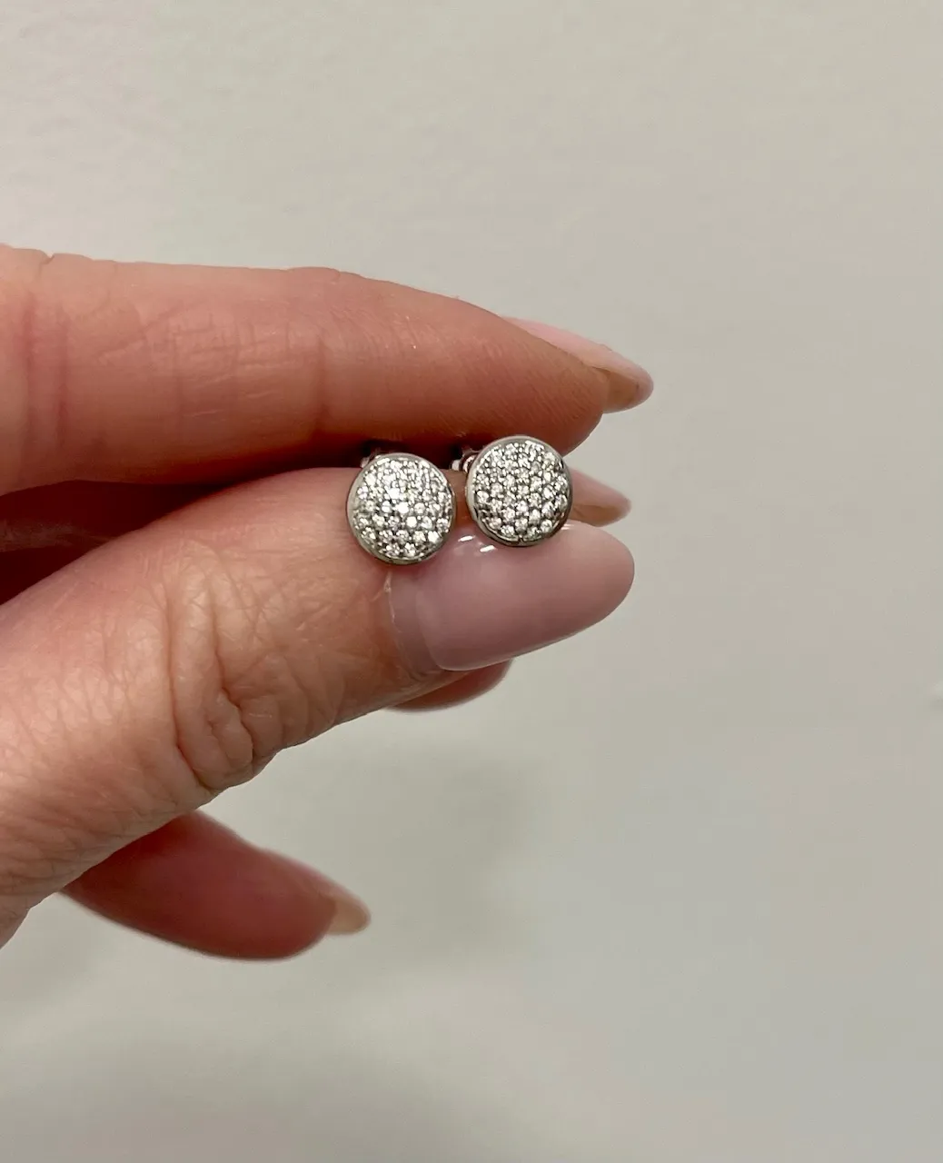 Krásne náušnice z bieleho 14 karátového zlata zdobené množstvom bielych zirkónov. Náušnice majú bezpečné šrobovacie zapínanie.