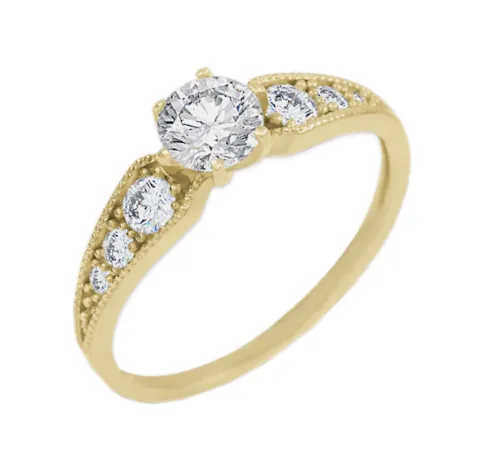 Výnimočný zlatý dámsky prsteň zdobí uprostred jeden výrazný zirkón a po krajoch má 3 postupne sa zmenšujúce okrúhle biele zirkóny, ktoré podčiarkujú jedinečnosť prsteňa.