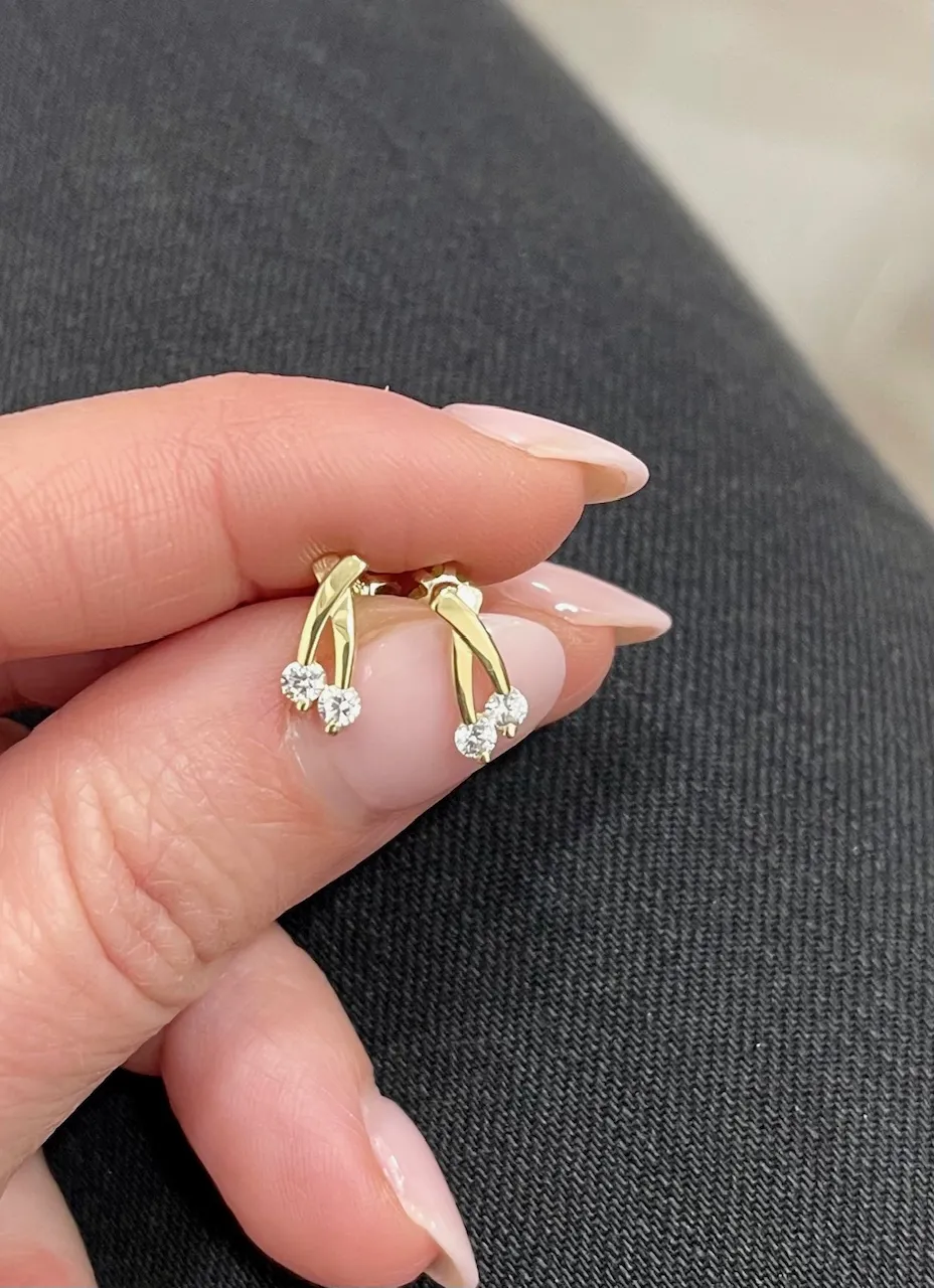 Krásne šrobovacie náušnice vyrobené zo žltého 14 karátového zlata s lesklou povrchovou úpravou. Náušnice zdobia biele zirkóny a ich tvar pripomína čerešne.